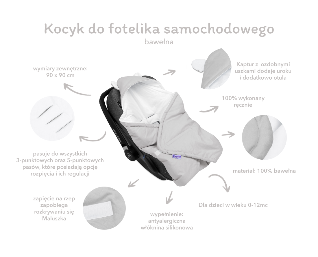 Kocyk, otulacz do fotelika samochodowego zapewni bezpieczne podróże Twojego dziecka samochodem. Jest to szybkie oraz wygodne rozwiązanie na chłodniejsze dni. Montujemy kocyk, otulacz do fotelika samochodowego a następnie wkładamy maluszka do tak przygotowanego fotelika i przykrywamy go. Szybko a zarazem bezpiecznie. Nie musimy ubierać dziecka w grubsze ubrania np. kurtkę, w której potem prawdopodobnie będzie mu gorąco podczas podróży. Dzięki zastosowaniu naszego kocyka, otulacza w każdej chwili możesz odkryć lub zakryć kocyk aby mieć pod kontrolą stopień ogrzania Twojego maluszka podczas Waszej wspólnej podróży. Unikniesz dzięki temu przegrzewania lub spocenia dziecka.