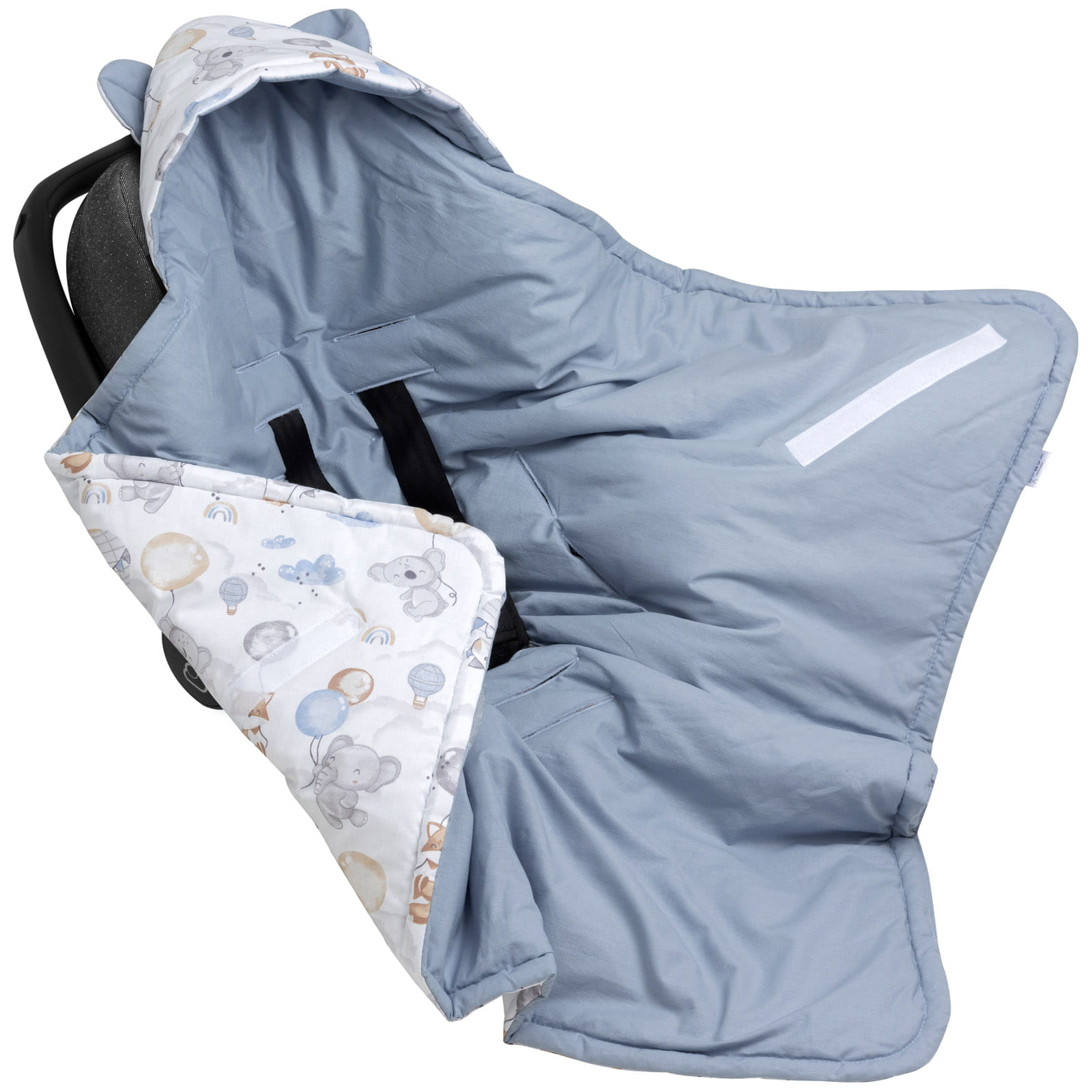 Bawełniany kocyk, otulacz z kapturem i uszkami do fotelika samochodowego