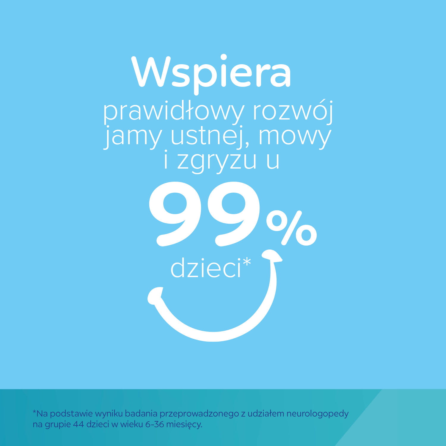 Wspiera prawidłowy rozwój jamy ustnej, mowy i zgryzu u 99% dzieci*.