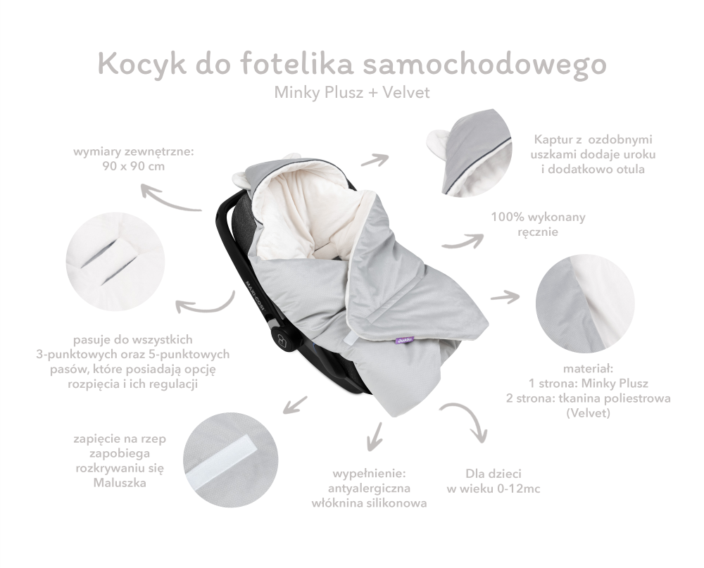 Kocyk, otulacz z kapturem do fotelika niemowlęcego z Velvetu i Minky Plusz 90 x 90 cm: