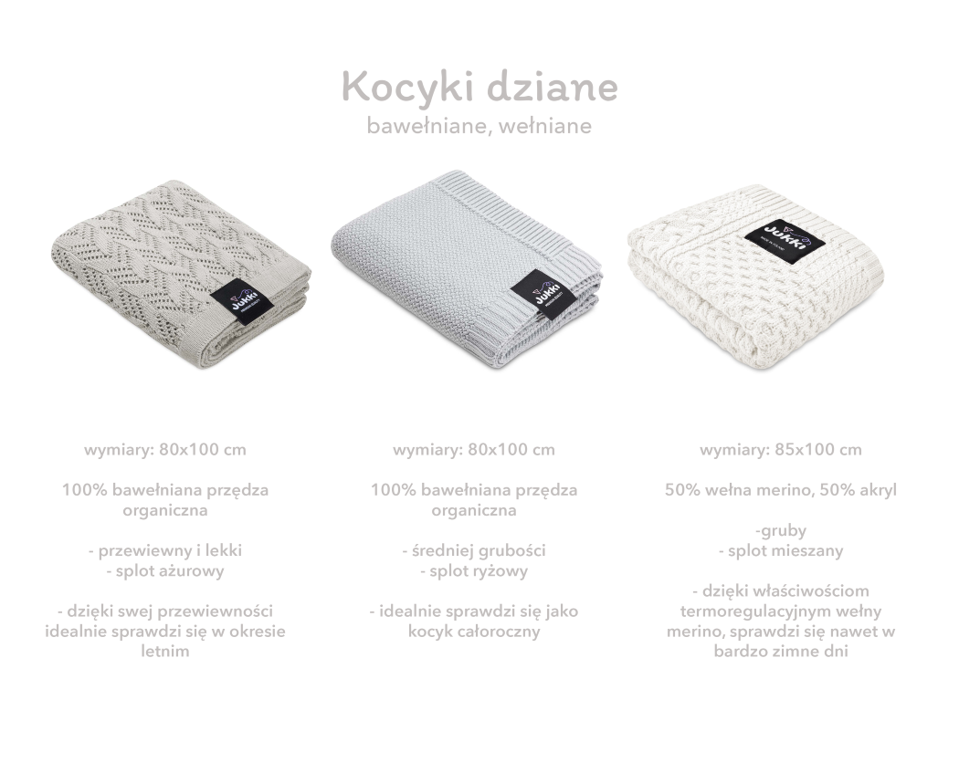 Kocyki JUKKI są tkane w Polsce z mięciutkiej przędzy wykonanej ze 100% bawełny. Świetnie regulują temperaturę co sprawia, że idealnie nadają się jako kocyki całoroczne. Są naturalne i antyalergiczne. Duża elastyczność umożliwia wygodne otulenie dziecka. Przy czym odpowiedni splot oraz właściwości przędzy bawełnianej zapewniają komfort termiczny.