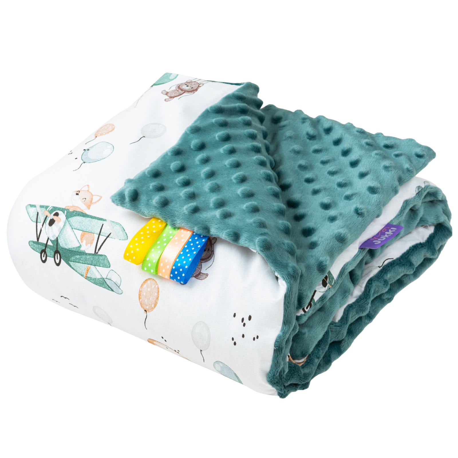 Kocyk posiada bezpiecznie wszyte, kolorowe tasiemki sensoryczne, które zainteresują dziecko i zapewnią zabawę oraz stymulują rozwój manualny. Kolory tasiemek mogą różnić się od przedstawionych na zdjęciach.