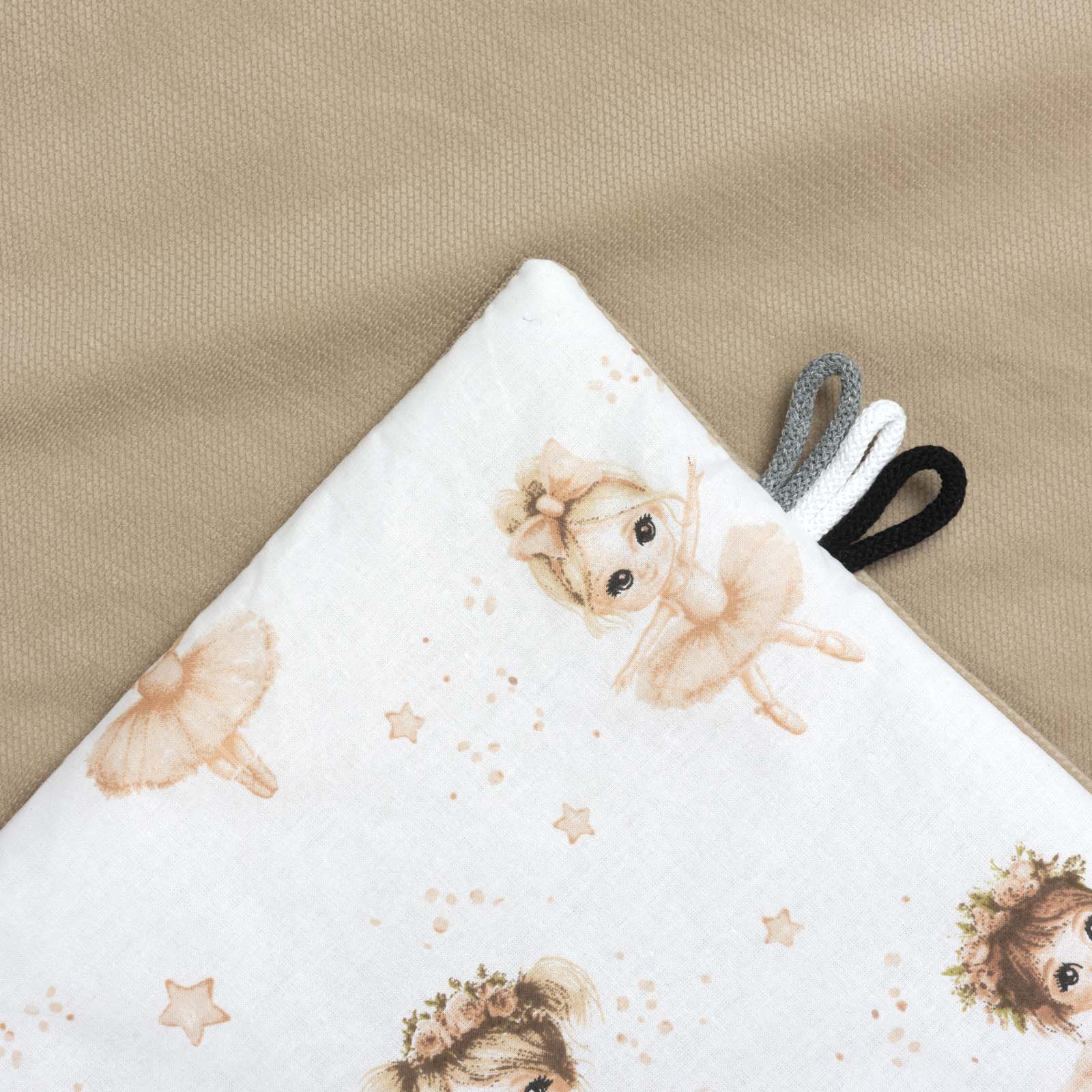 Kocyk posiada bezpiecznie wszyte, kolorowe pętelki, które zainteresują dziecko i zapewnią zabawę oraz stymulują rozwój manualny.