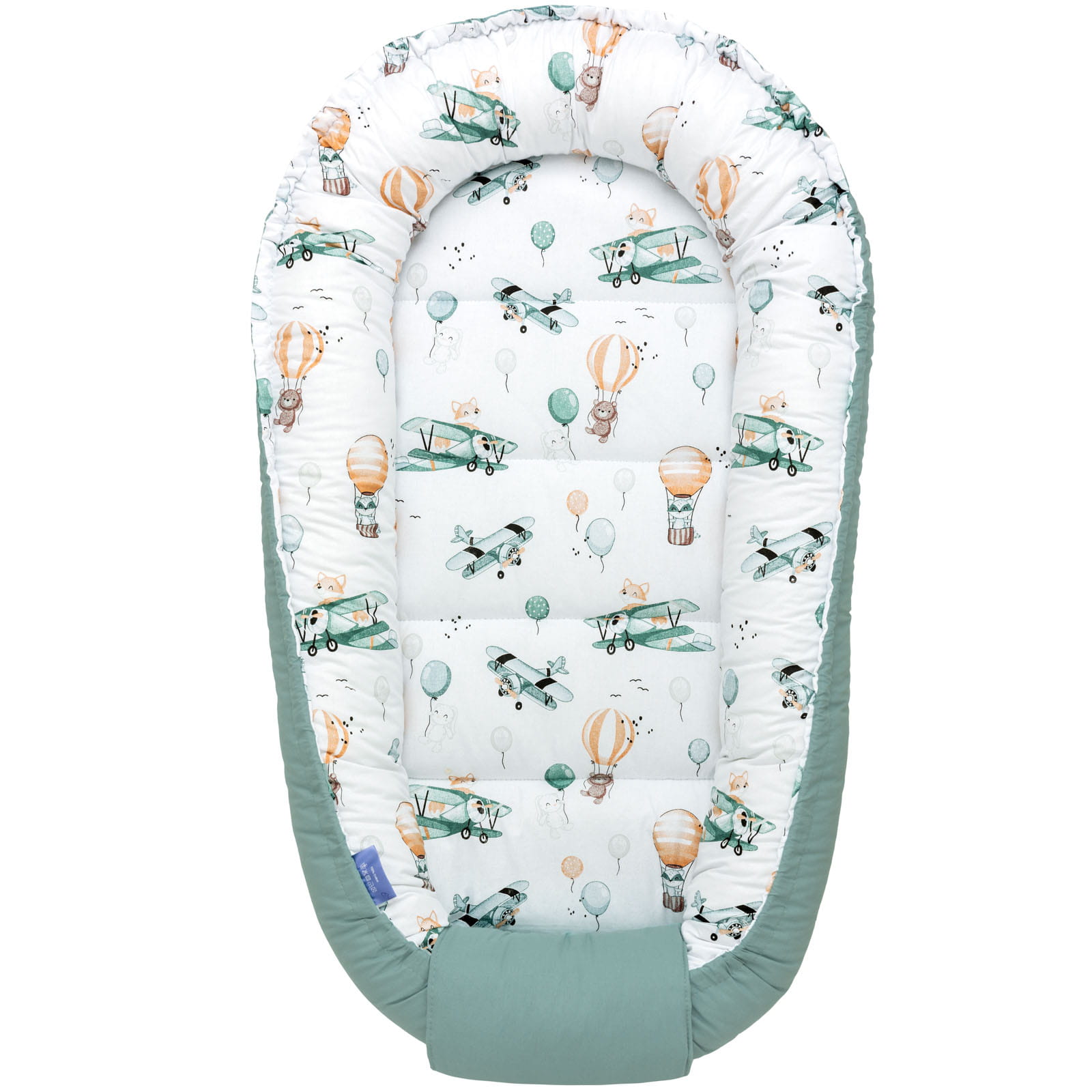 - w łóżeczku - kokon zapewnia ochronę przed twardymi szczebelkami łóżeczka a wysokie brzegi kokonu ułatwiają układanie dziecka na boku, co jest bardzo ważne np. gdy Maluszkowi się ulewa,