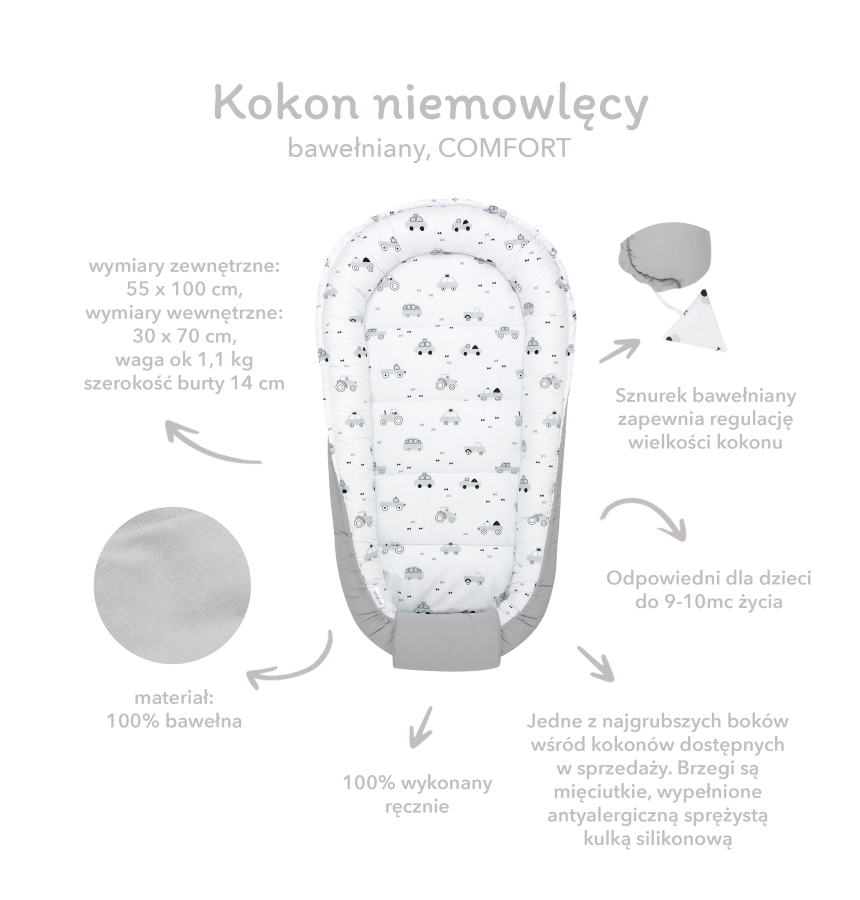 W pierwszych tygodniach życia niemowlęcia polecamy ścisnąć kokon, by jak najbardziej otulał. W kolejnych tygodniach kokon można rozluźniać i indywidualnie dostosowywać do potrzeb Waszego Maluszka. Sznurek bawełniany zapewnia regulację wielkości kokonu, a użycie dwóch wzorów i możliwość ich odwracania zapewnia stymulację wzrokową niemowlęcia i powoduje, że łóżeczko jest dla niego ciekawym obiektem do obserwacji. Nasz kokon rośnie wraz ze swoim właścicielem!