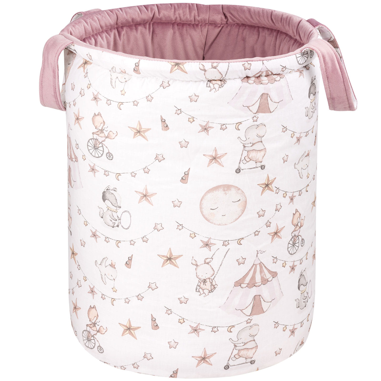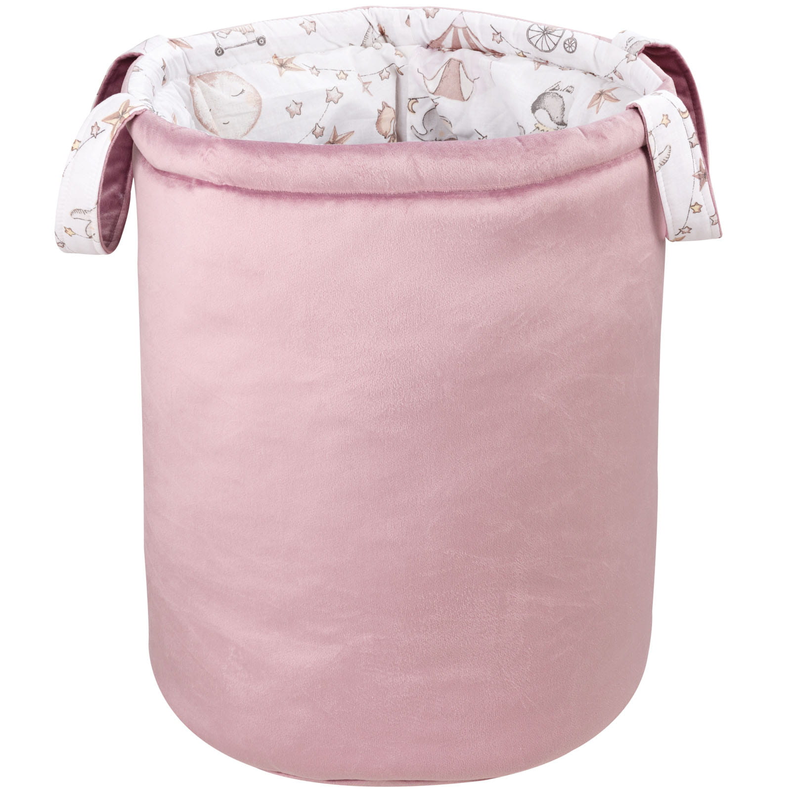 Kosz na zabawki Jukki, który świetnie sprawdzi się w pokoju dziecięcym, a także w innych pomieszczeniach w naszych domach. Kosz wykonany jest ze 100% przepięknej i mięciutkiej bawełny oraz velvetu, w środku wypełniony usztywniającą antyalergiczną włókniną silikonową. Posiada solidne i wytrzymałe uszy, które ułatwiają jego przenoszenie. To idealne rozwiązanie pozwalające na utrzymanie porządku w pokoju dziecka.