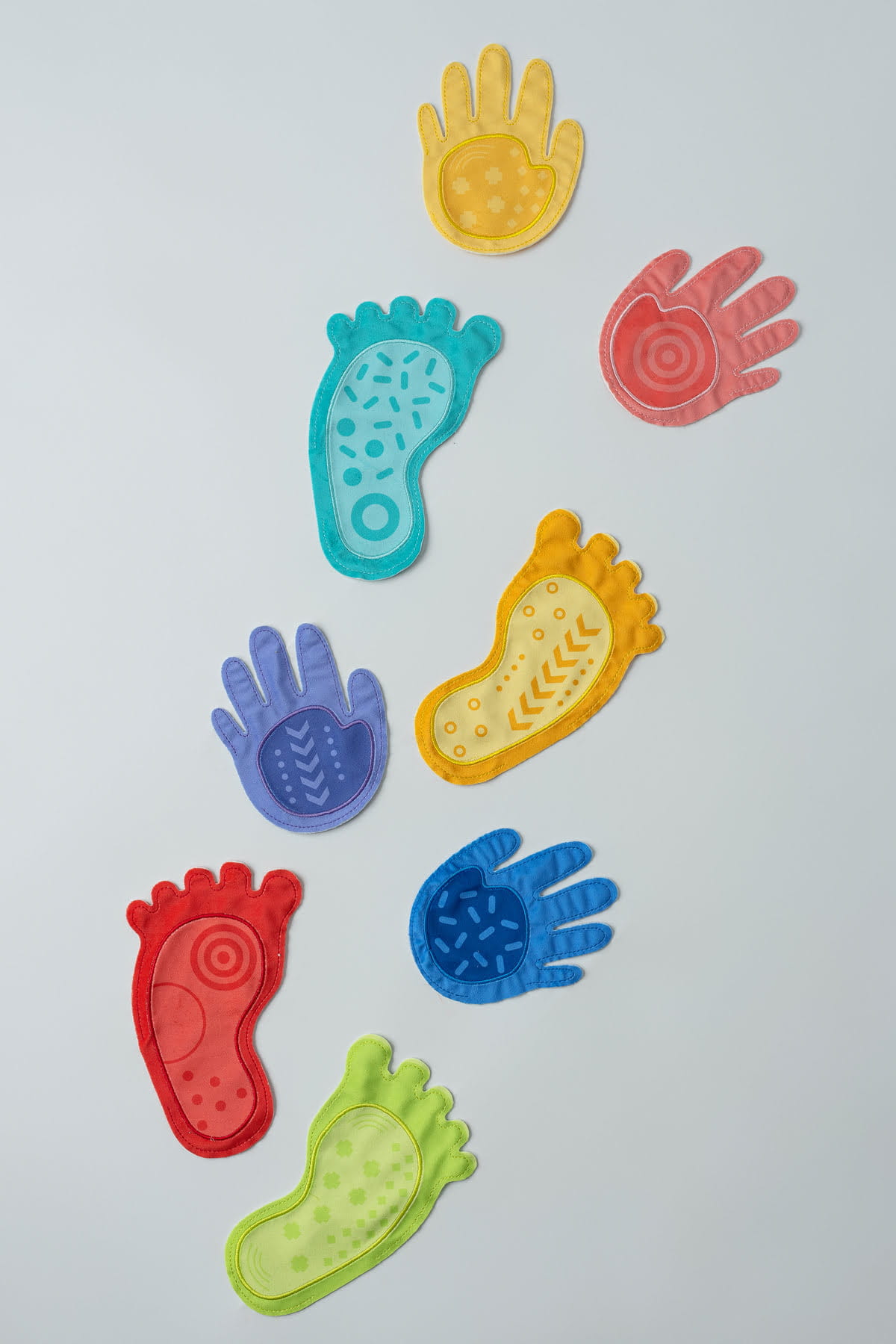 - 8 milutkich woreczków sensorycznych z różnymi wypełnieniami w kształcie stóp i dłoni