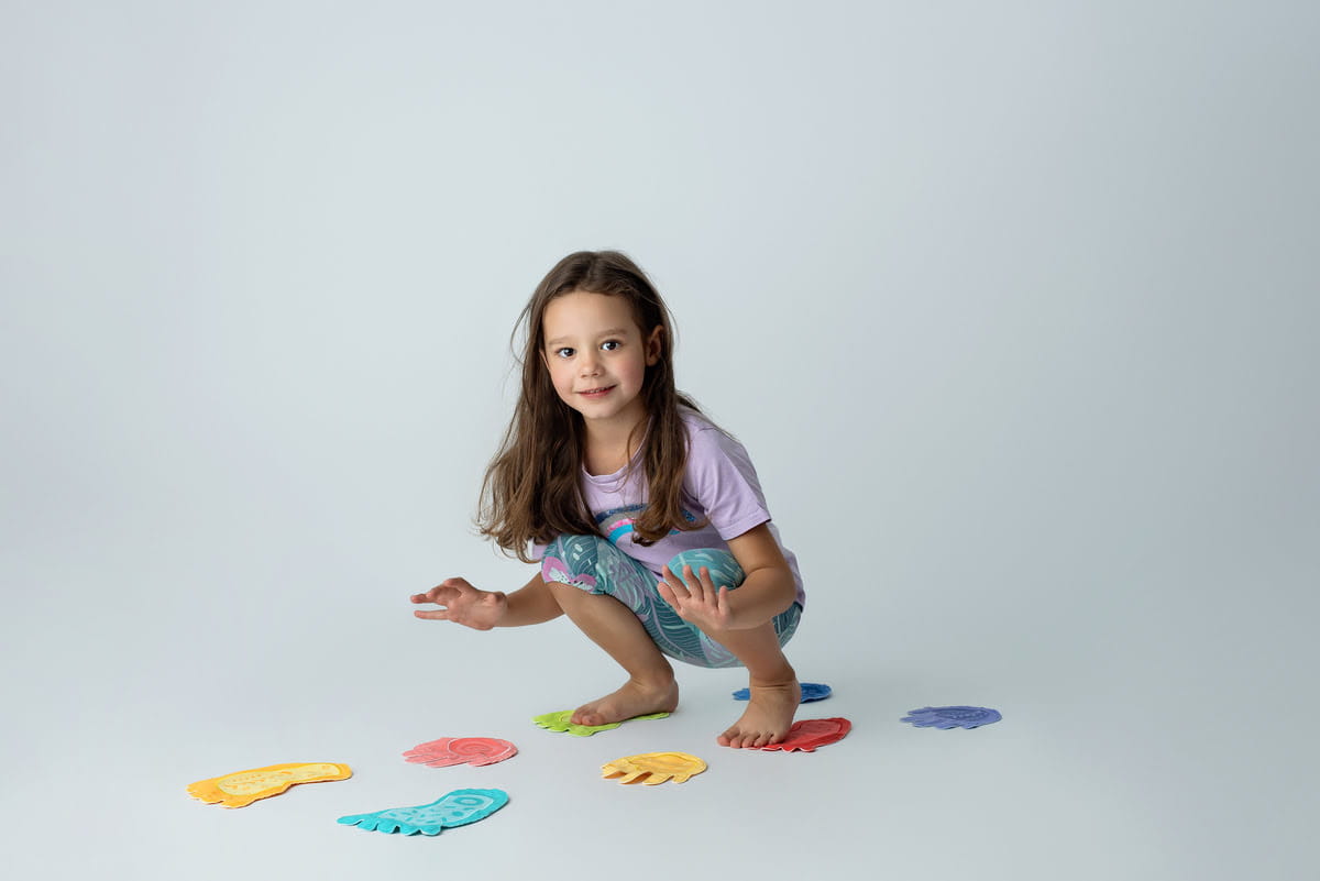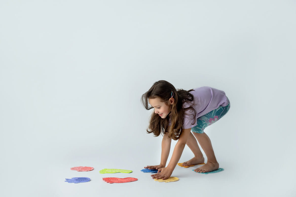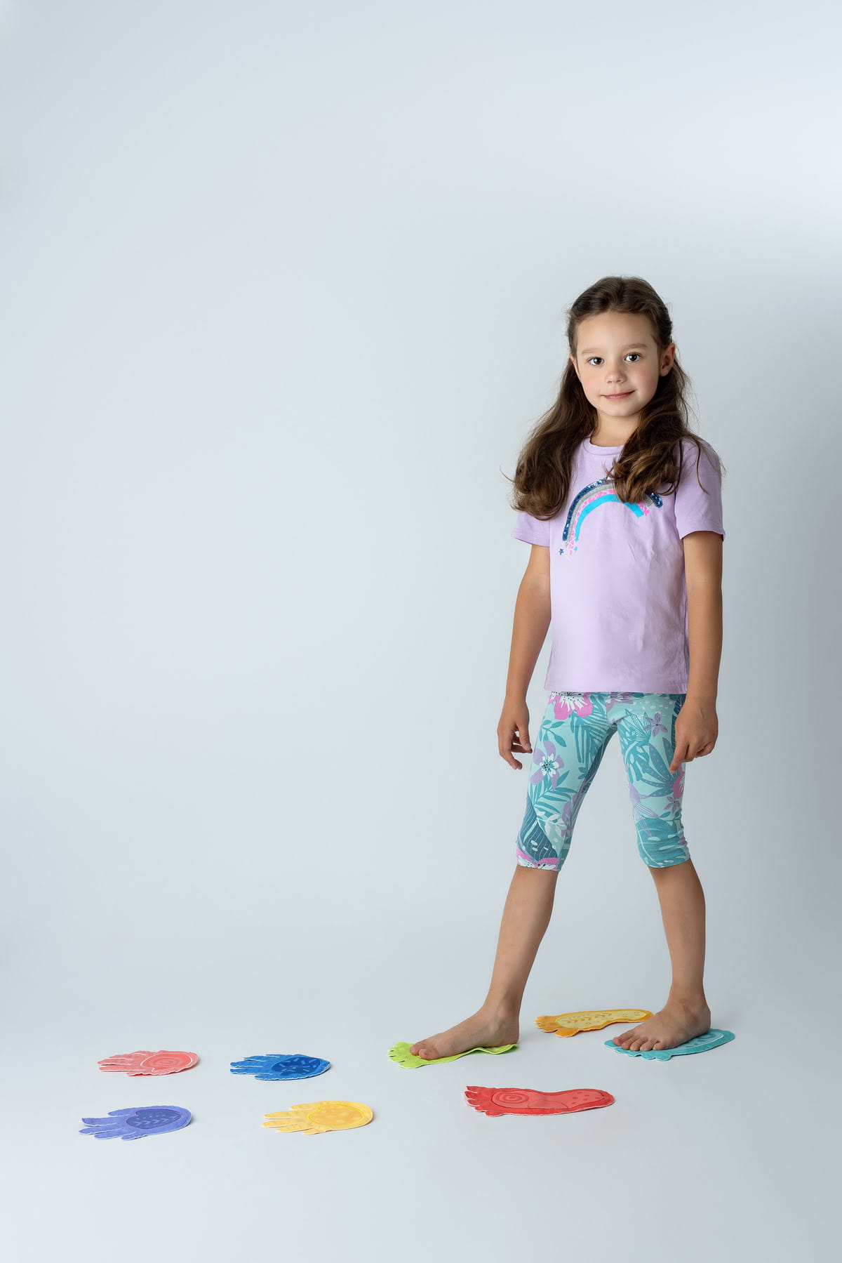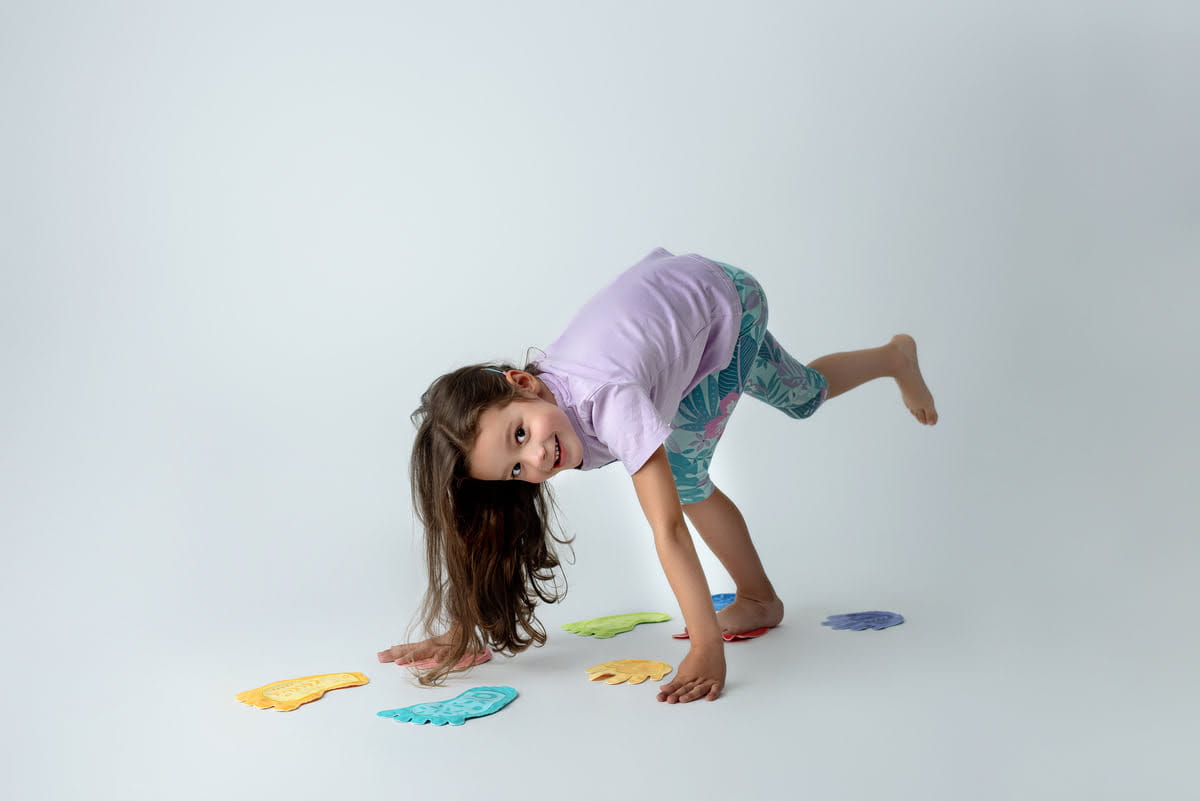 - woreczki sensoryczne, doskonalące umiejętności motoryczne poprzez chwytanie palcami stóp, rzucanie i podawanie, czy układanie wieży. Trzecią opcją jest nawiązanie do gry Twister, gdzie dziecko kładzie swoje dłonie i stopy na stópkach i dłoniach z zabawki.