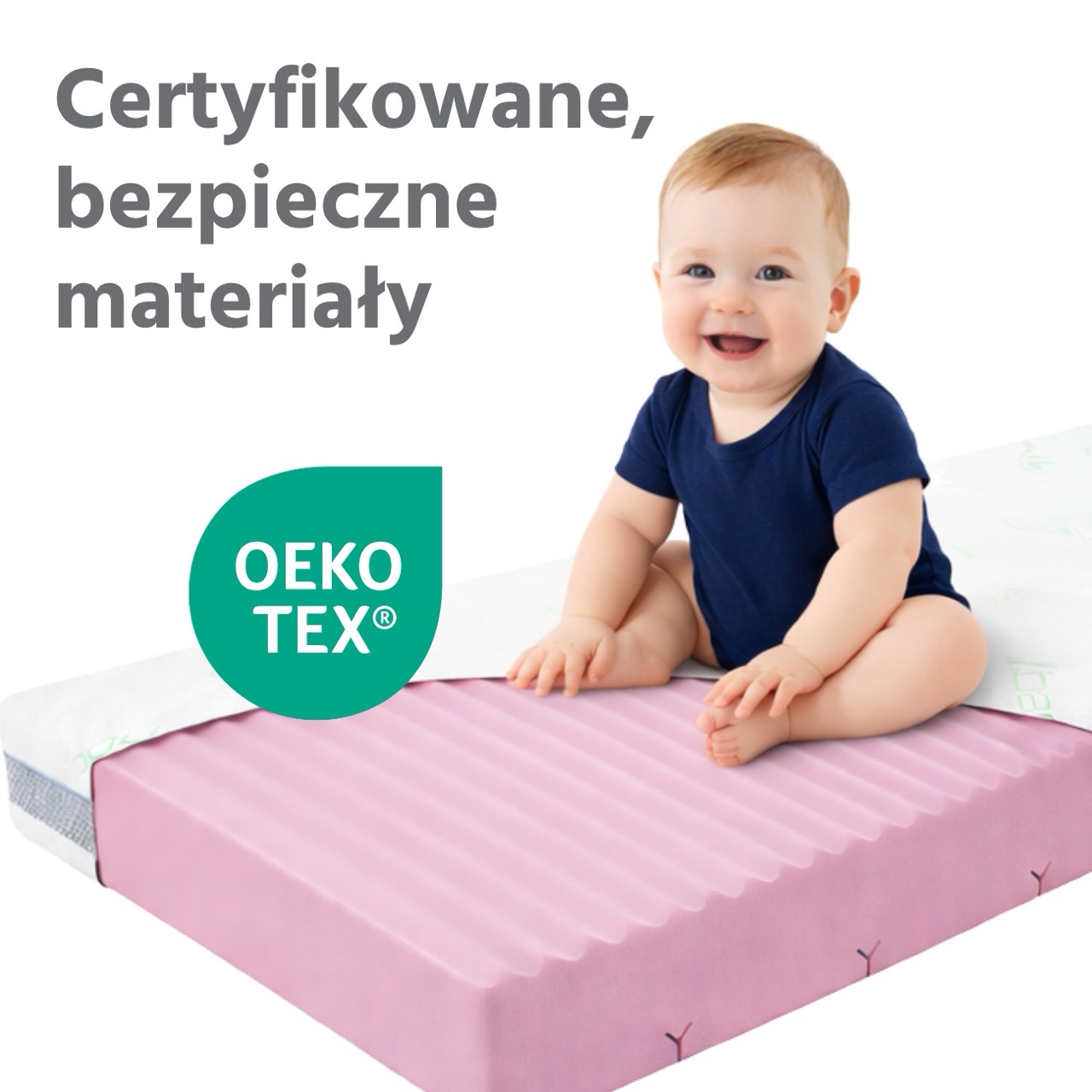 Wszystkie komponenty materaca posiadają certyfikat Oeko-Tex Standard 100, co oznacza, że są wolne od substancji szkodliwych dla zdrowia dziecka.