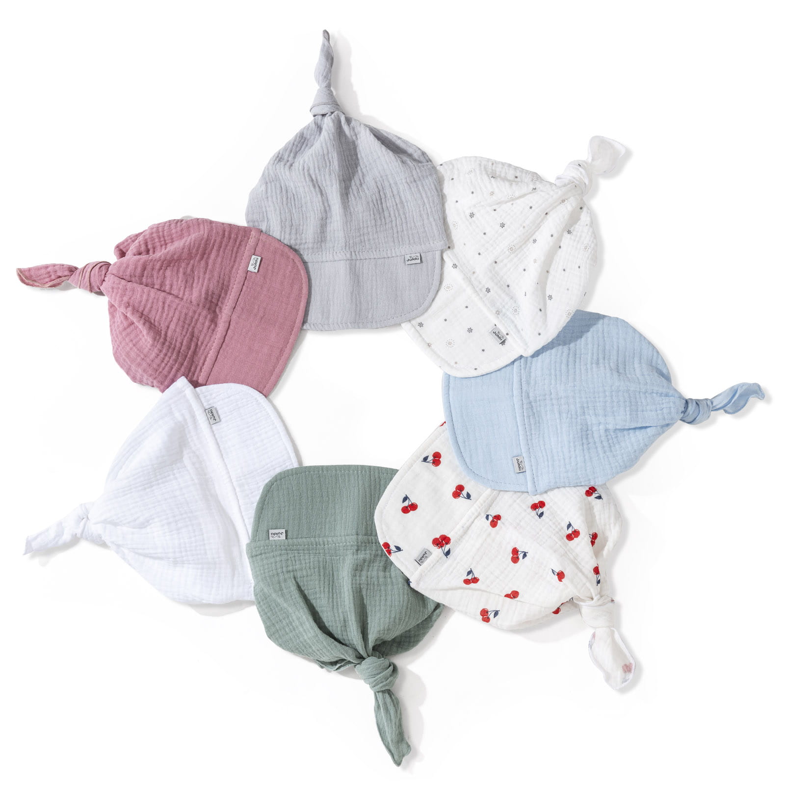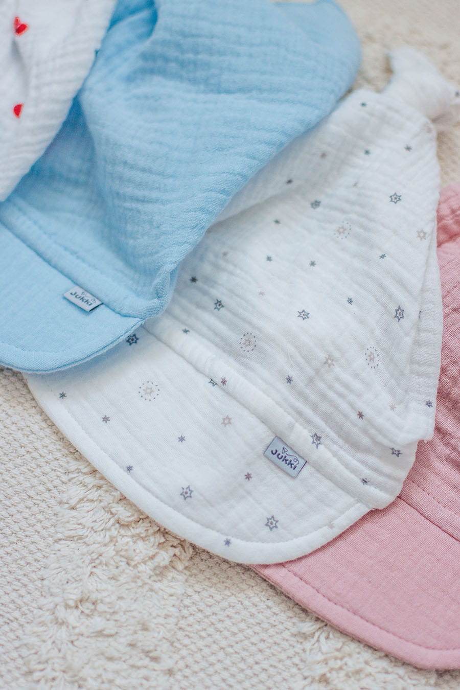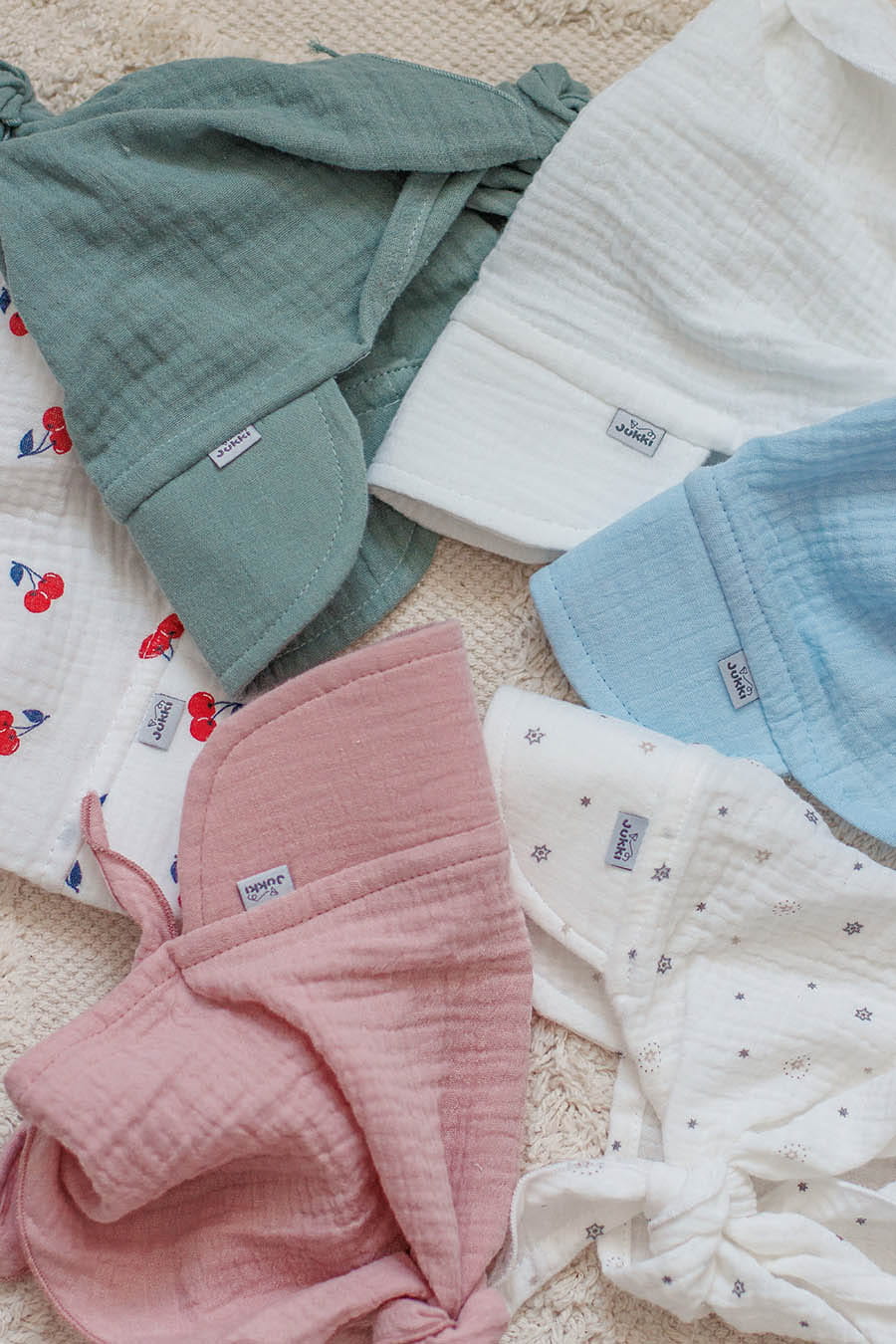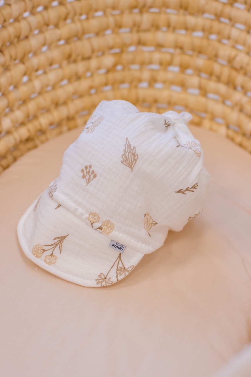 Nasze muślinowe chustki z daszkiem szyjemy ręcznie. Dostępne są w kilku wariantach kolorystycznych.