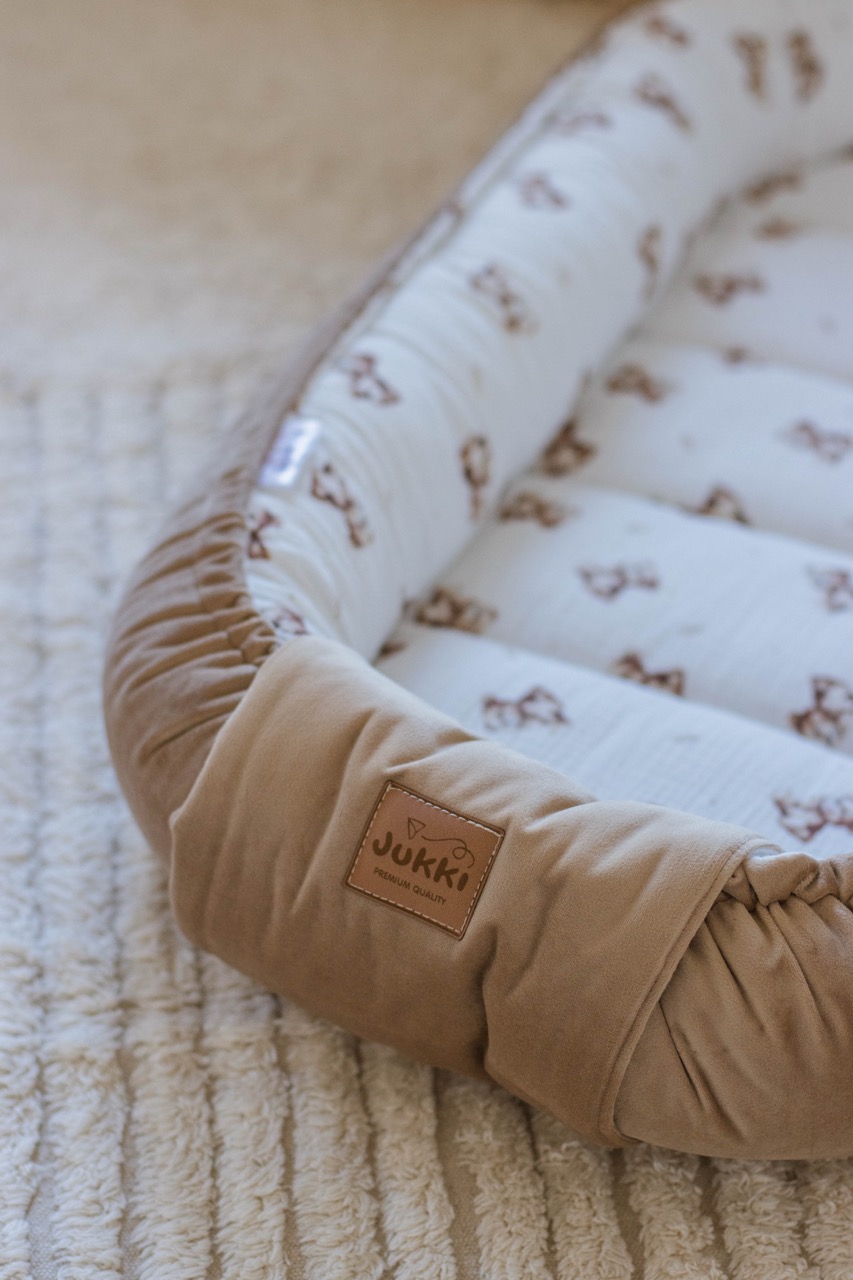 Kokon można skompletować z innymi produktami Jukki – mięciutkimi kocykami Minky, dekoracyjnymi poduszkami, koszami na zabawki – tak, by przestrzeń twojego malucha była harmonijna i tworzyła spójną całość.
