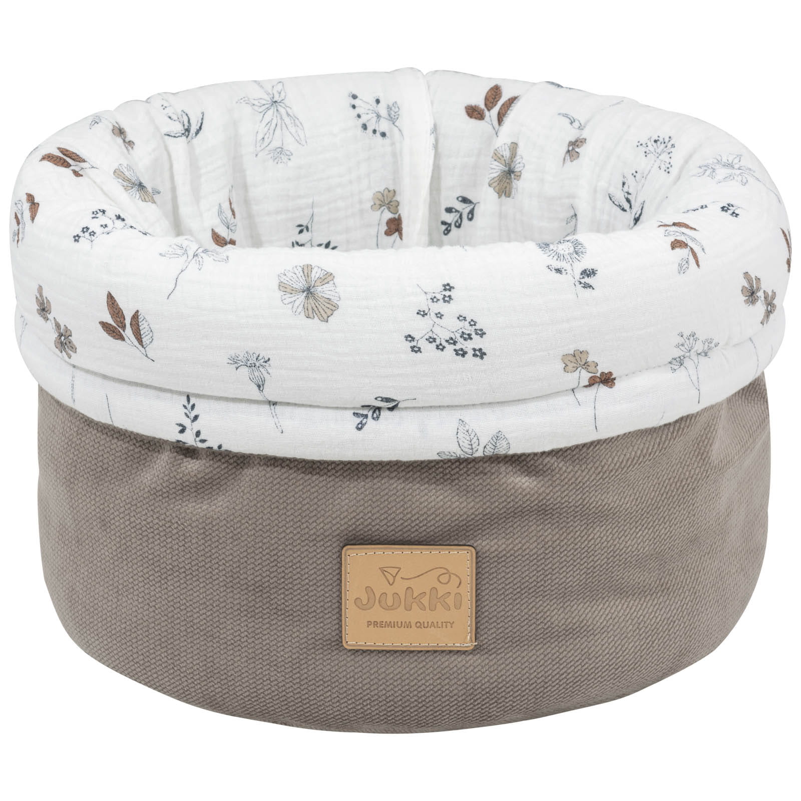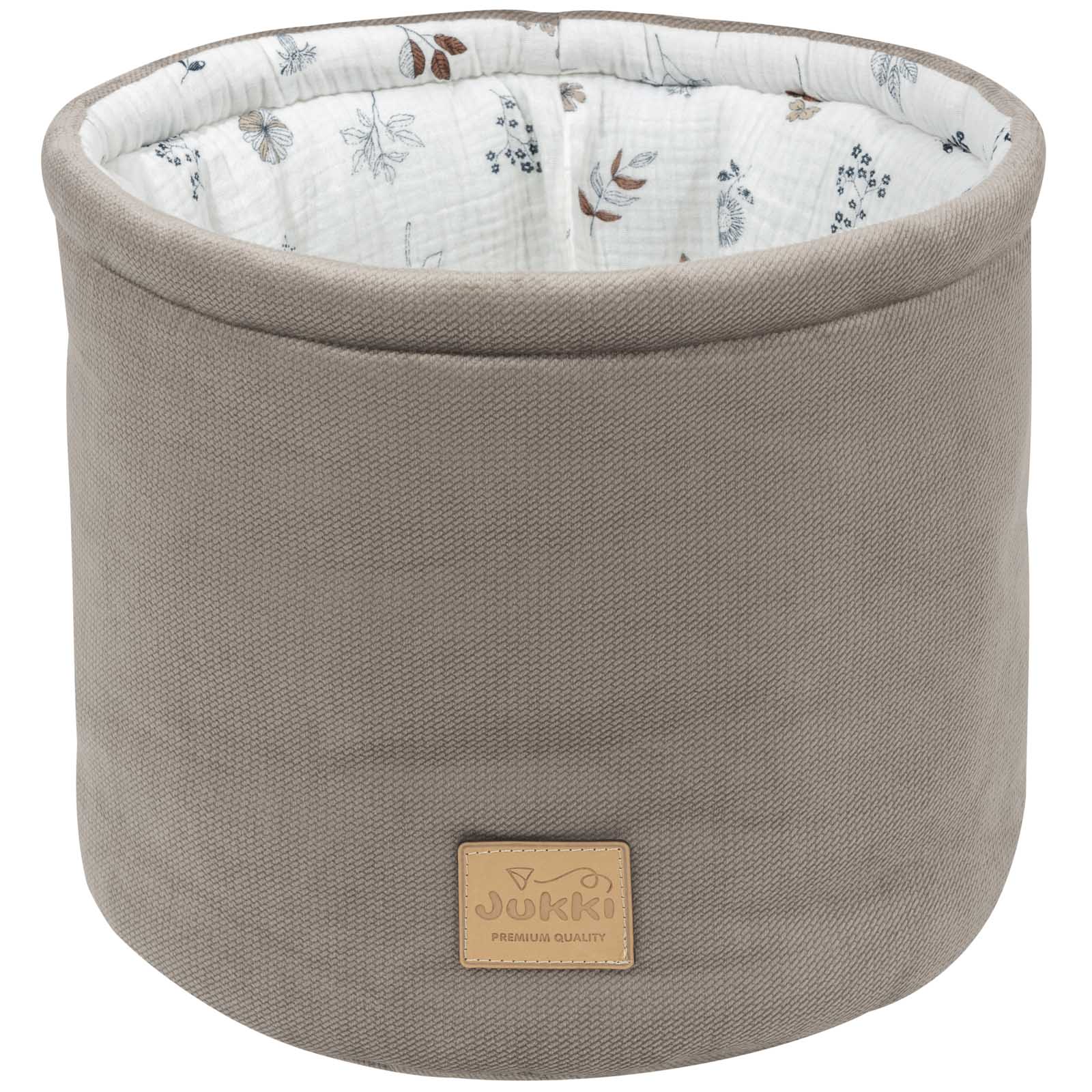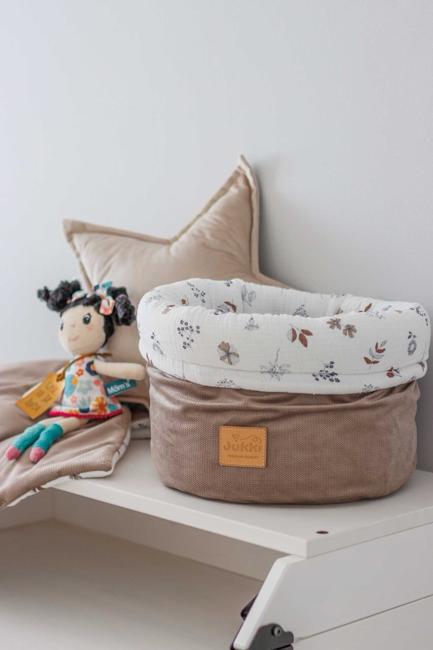 Koszyk Jukki jest uszyty ręcznie z naturalnego, 100% bawełnianego muślinu z dodatkiem tkaniny velvet. Wypełnienie organizera to antyalergiczna włóknina silikonowa o gramaturze 300g/m2.