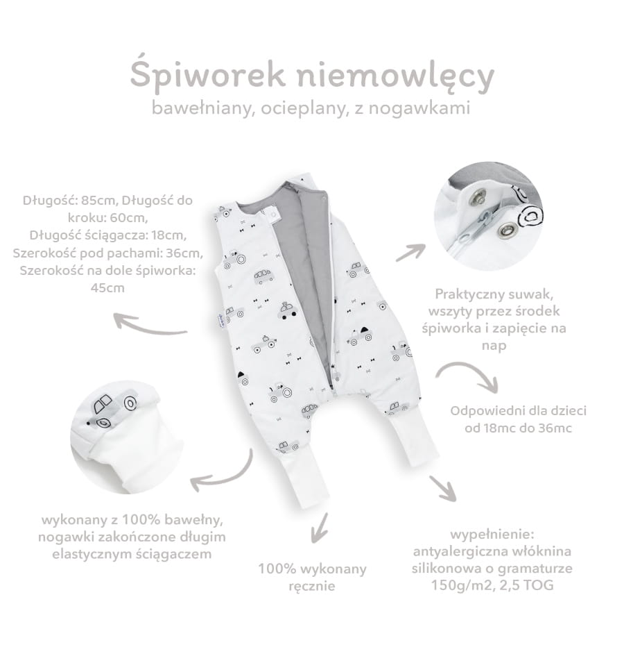 - Grubość to 2.5 TOG – śpiworek jest całoroczny i zapewnia komfort termiczny podczas snu w temperaturze pokojowej (18-21ºC).