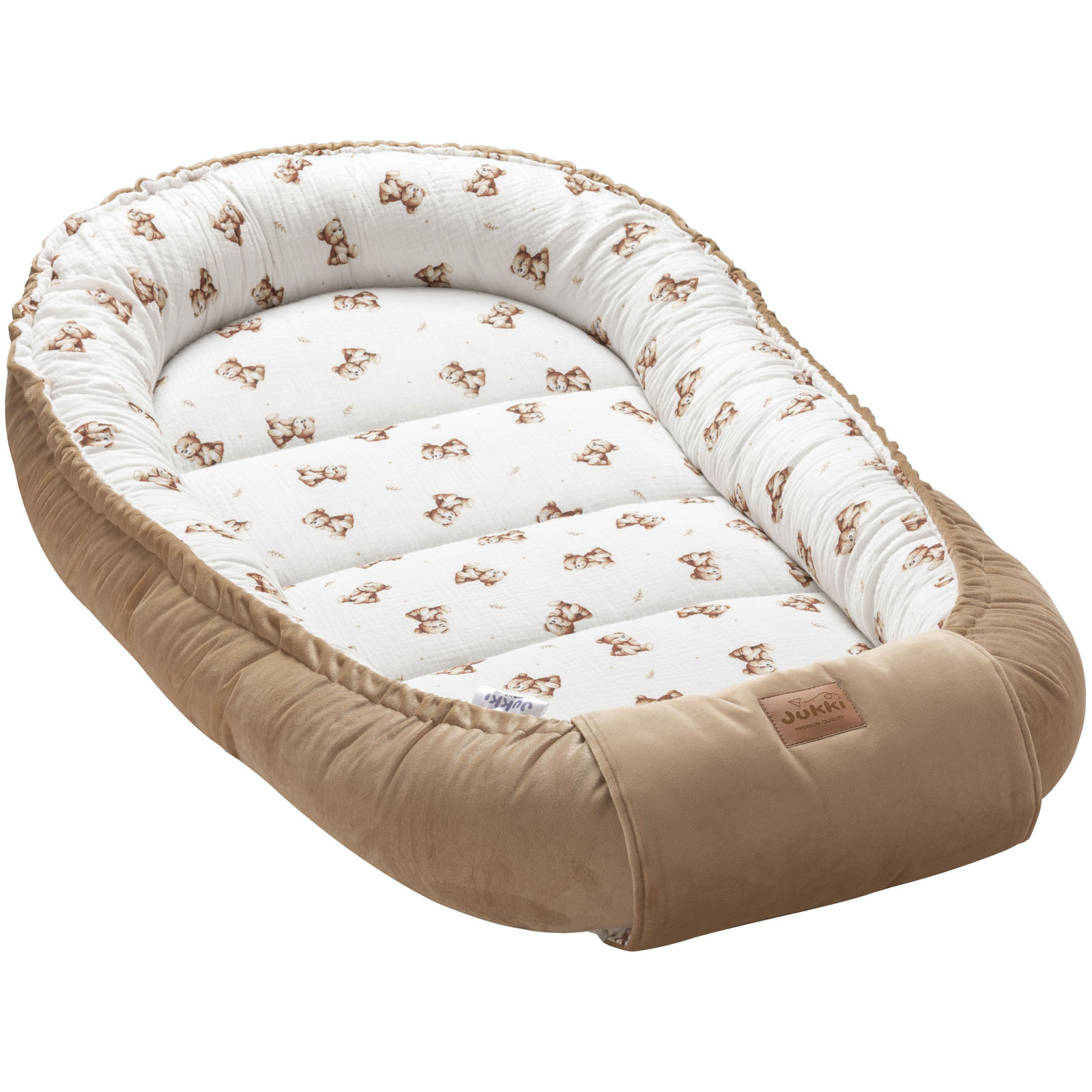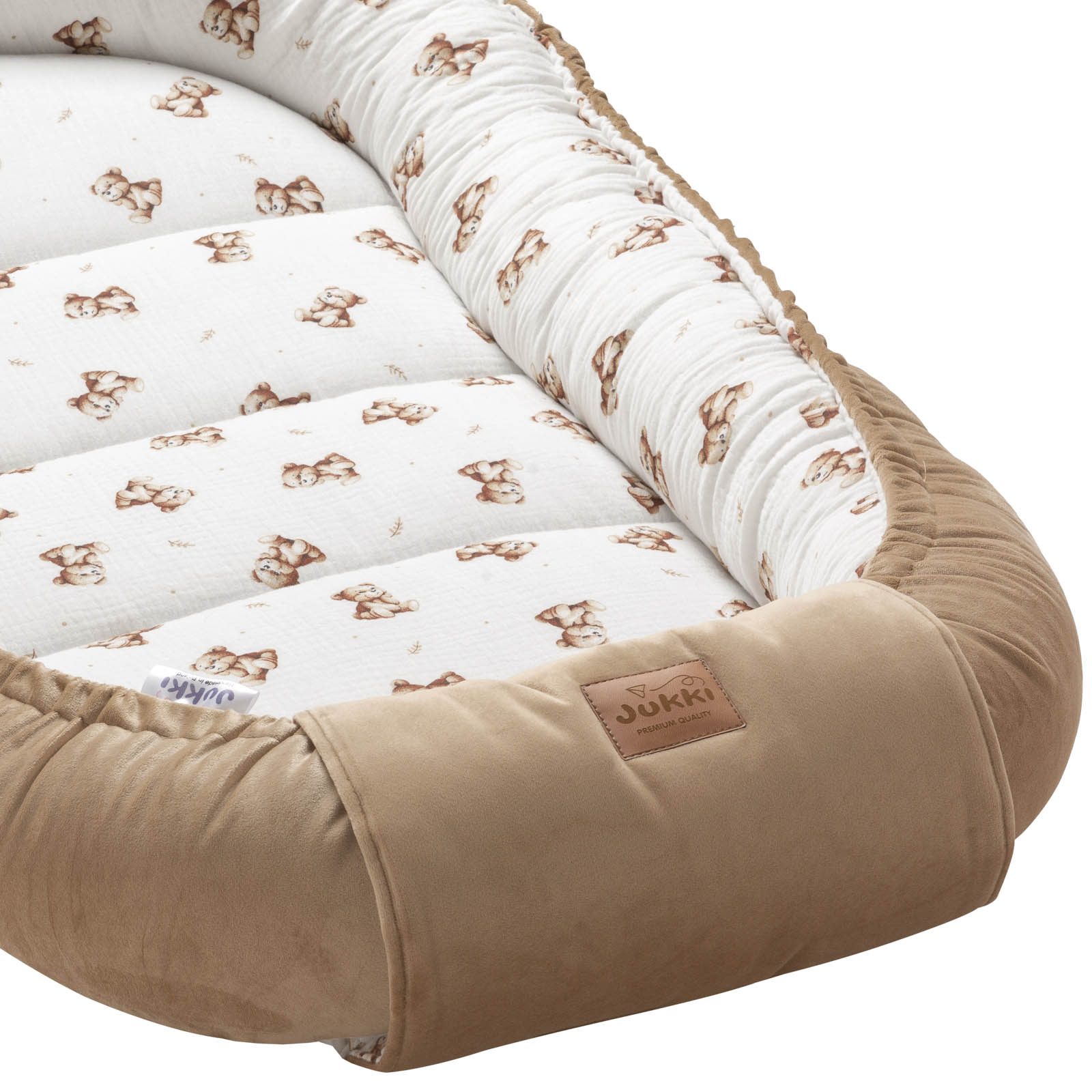 Kokon można skompletować z innymi produktami Jukki – mięciutkimi kocykami Minky, dekoracyjnymi poduszkami, koszami na zabawki – tak, by przestrzeń twojego malucha była harmonijna i tworzyła spójną całość.
