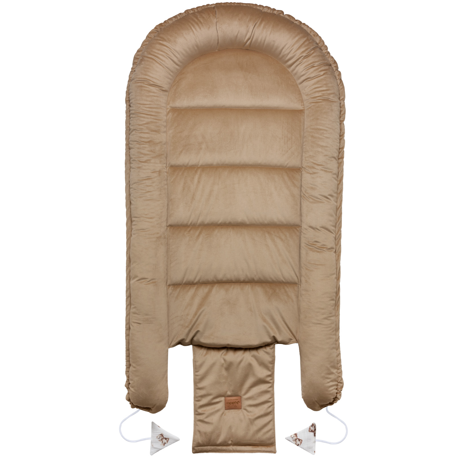 Gniazdko doskonale służy także starszym maluszkom stając się idealną przestrzenią do zabawy, leżenia na brzuszku i pierwszych ćwiczeń – podnoszenia główki czy leżących w jego zasięgu grzechotek. Rozwiązanie sznurków pozwala na używanie kokonu jako przewijaka.