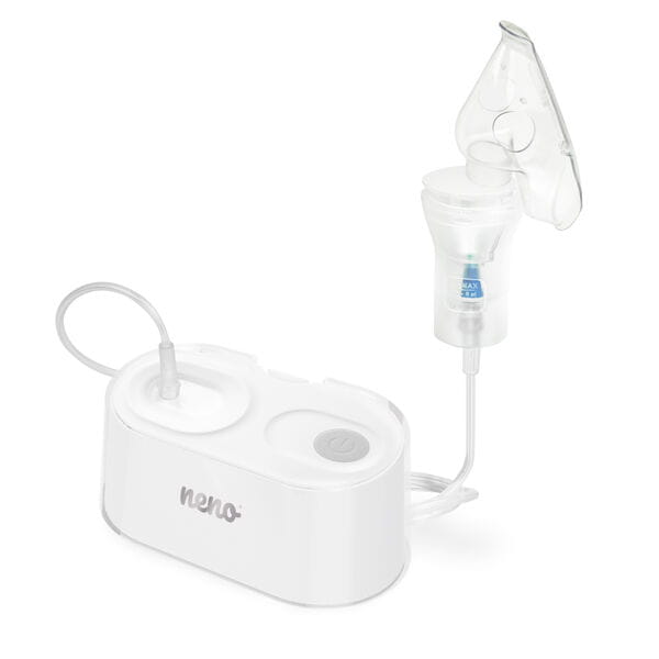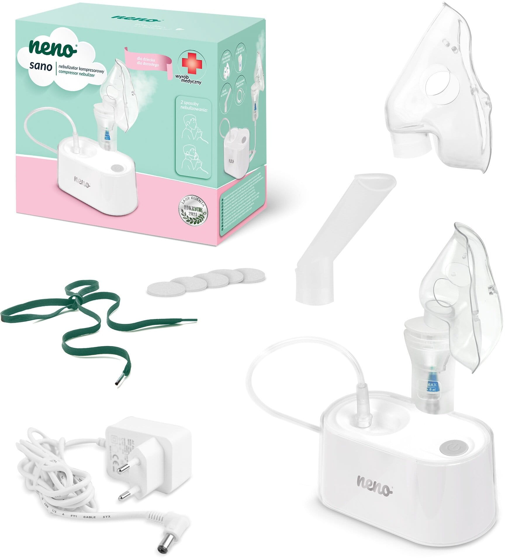 Neno Sano to nowoczesny, cichy i łatwy w obsłudze nebulizator kompresorowy z długim przewodem, dużym pojemnikiem na lek i dwiema maseczkami, idealny dla całej rodziny do skutecznej inhalacji.