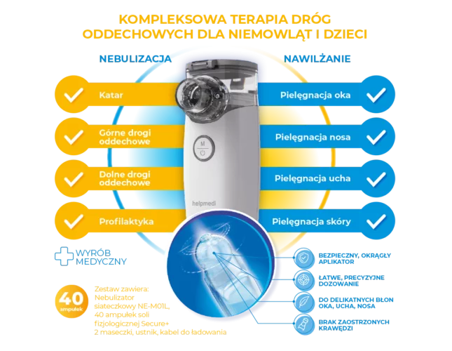 W skład zestawu wchodzi bezprzewodowy nebulizator siateczkowy oraz 40 ampułek fizjologicznego roztworu soli Katarek Secure+, który może być wykorzystywany do nebulizacji, nawilżania i pielęgnacji. Atutem ampułki jest innowacyjna, okrągła budowa główki o zwiększonym profilu bezpieczeństwa. Dzięki temu zmniejszone jest ryzyko przypadkowego uszkodzenia oka czy nosa. Łagodne linie i brak ostrych krawędzi czynią zabiegi pielęgnacyjne bezpieczniejszymi nawet w przypadku noworodków.