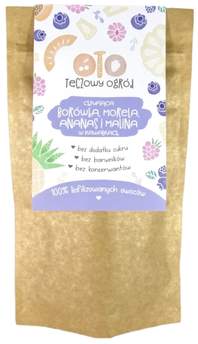 Skład: 100% owoce liofilizowane w kawałkach: borówka (25%), morela (25%), malina (25%), ananas (25%)