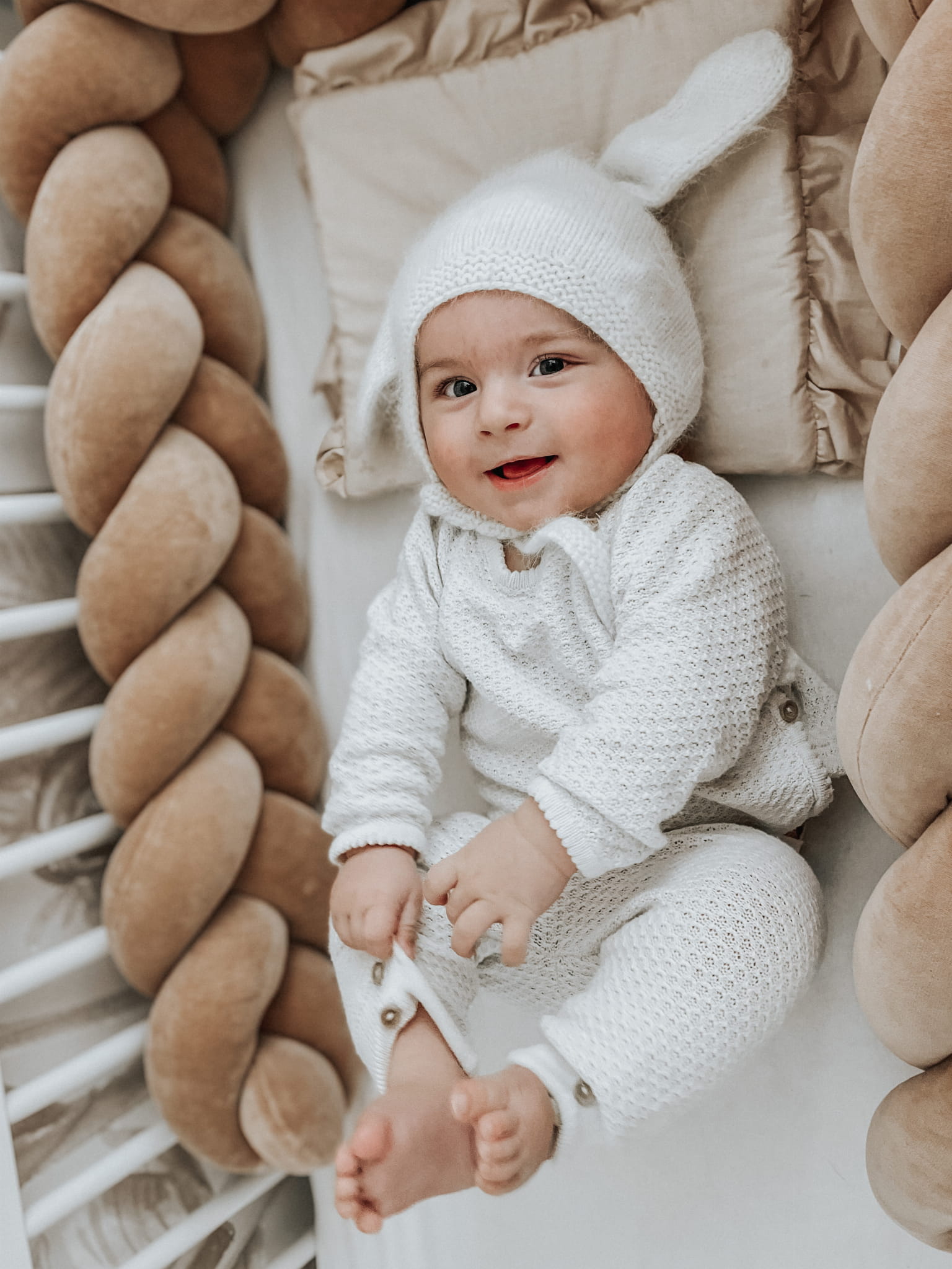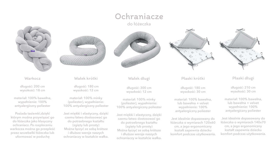 - kiedy dziecko jest starsze i potrzebuje więcej miejsca w łóżeczku, warkocz można rozpleść, a jego sploty przepleść przez szczebelki łóżeczka. Efekt ochronny pozostanie zachowany, w łóżeczku będzie więcej przestrzeni, a dodatkowo warkocz prezentował się będzie nadal bardzo stylowo i elegancko,