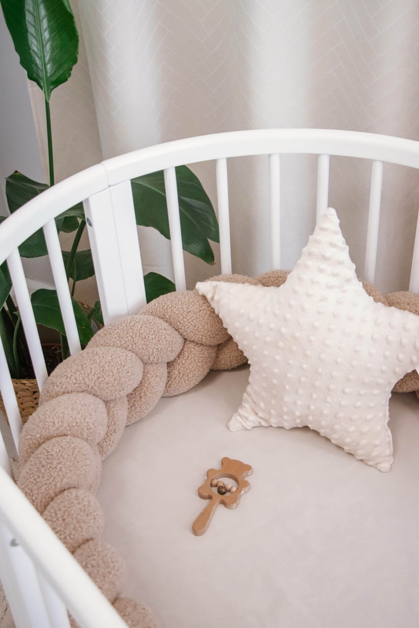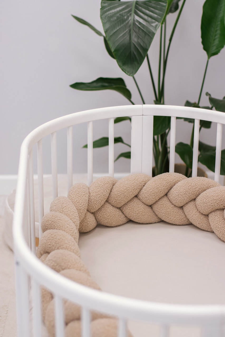 - kiedy dziecko jest starsze i potrzebuje więcej miejsca w łóżeczku, warkocz można rozpleść, a jego sploty przepleść przez szczebelki łóżeczka. Efekt ochronny pozostanie zachowany, w łóżeczku będzie więcej przestrzeni, a dodatkowo warkocz prezentował się będzie nadal bardzo stylowo i elegancko,