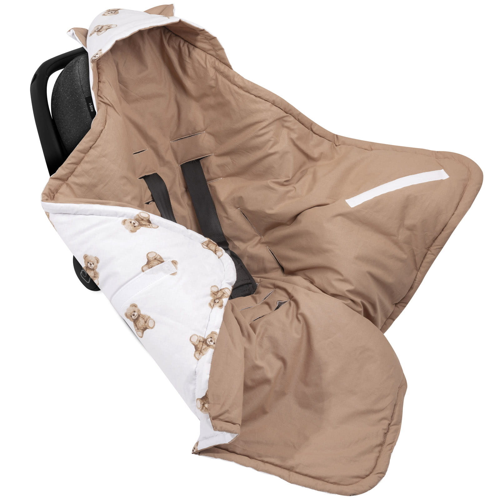 Bawełniany kocyk, otulacz z kapturem i uszkami do fotelika samochodowego