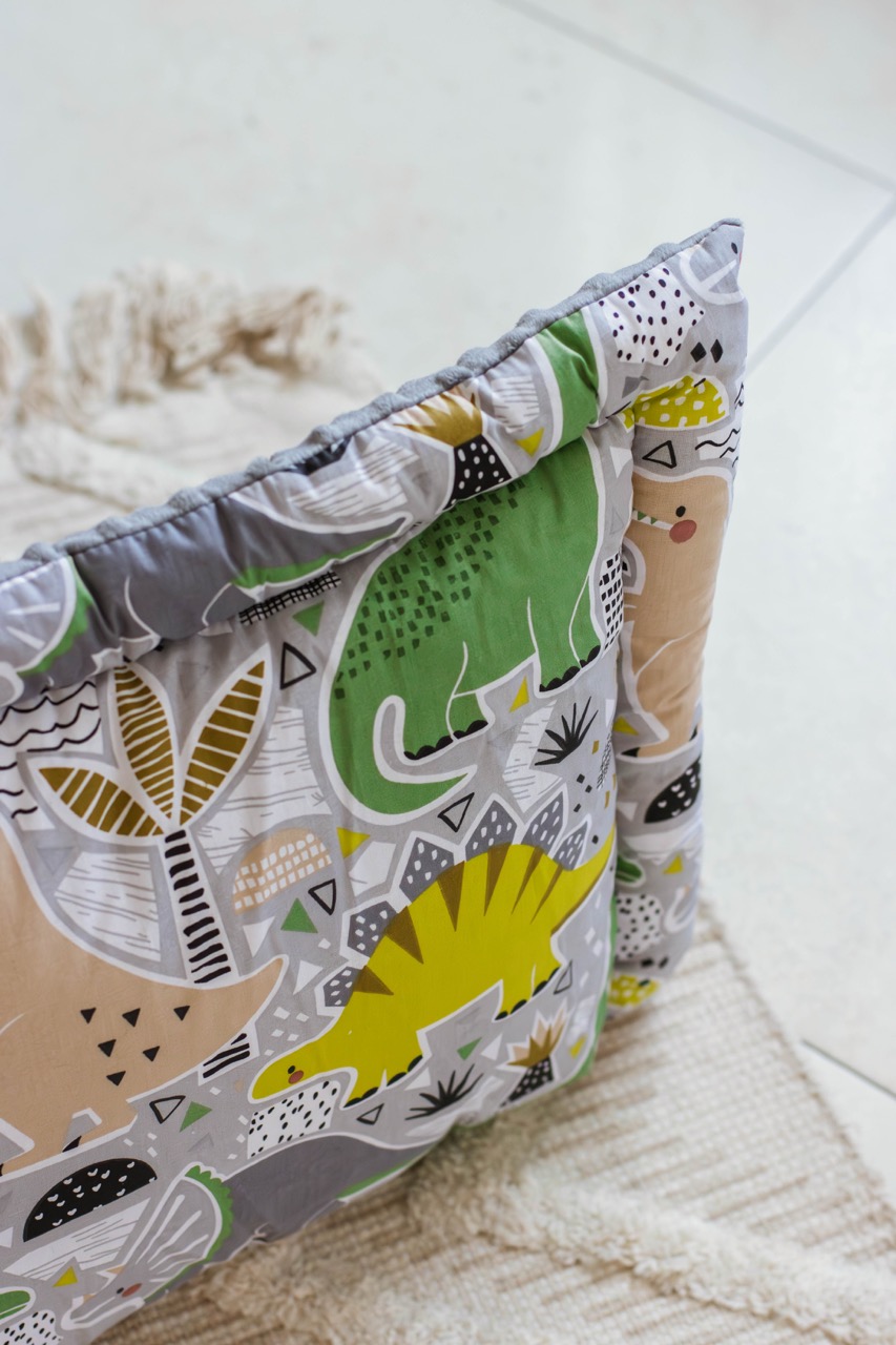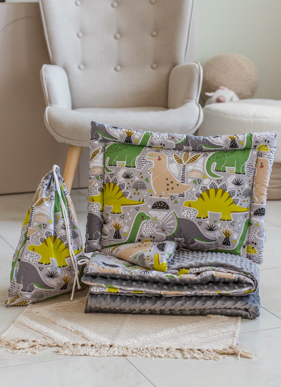 (Outlet) Zestaw przedszkolaka (kocyk z poduszką) - Dinosaurs i Grey Minky