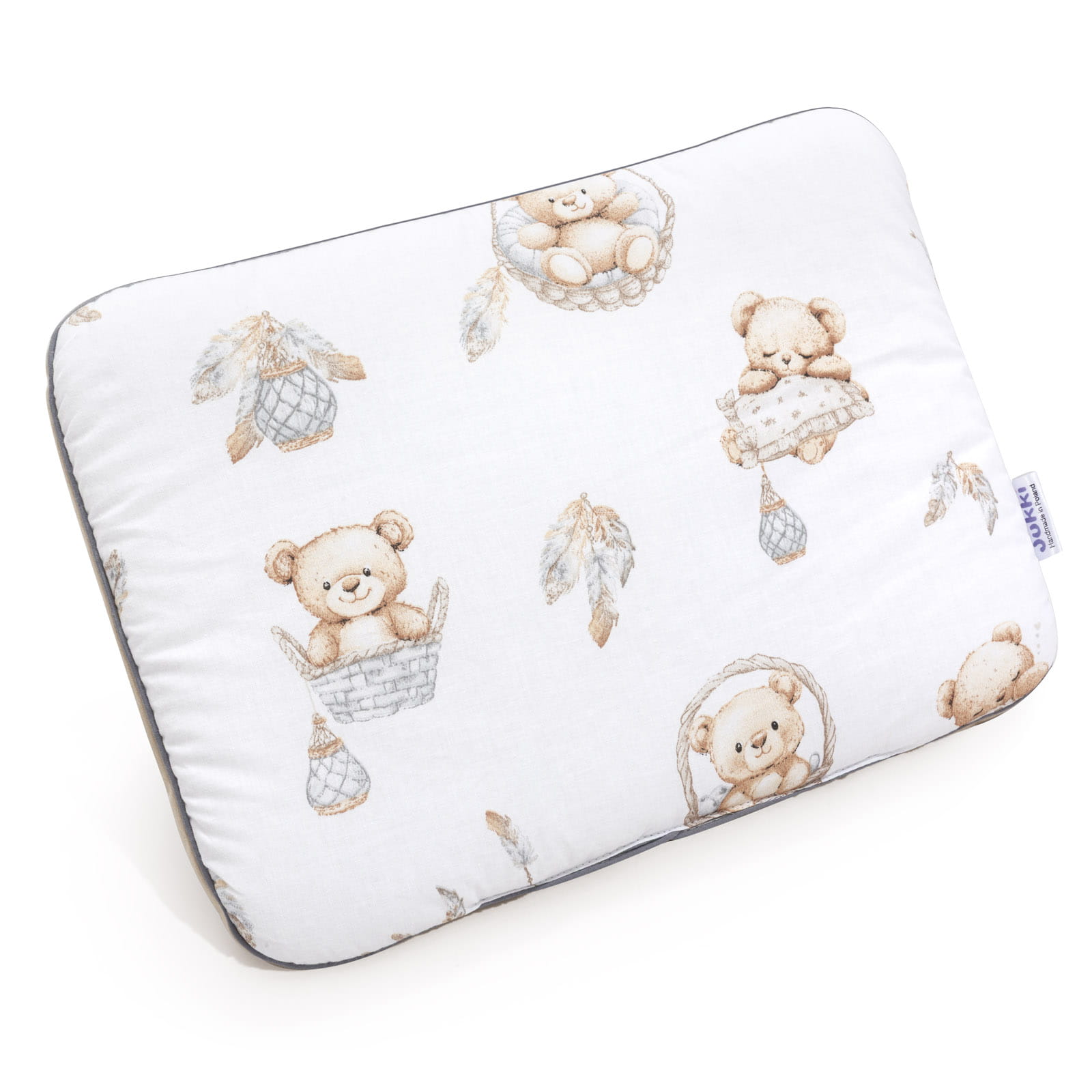 Kolorowa i miękka płaska poduszka niemowlęca JUKKI sprawi, że łóżko Twojego dziecka będzie jeszcze bardziej przytulne. Poduszka idealnie sprawdzi się od 1 dnia życia.