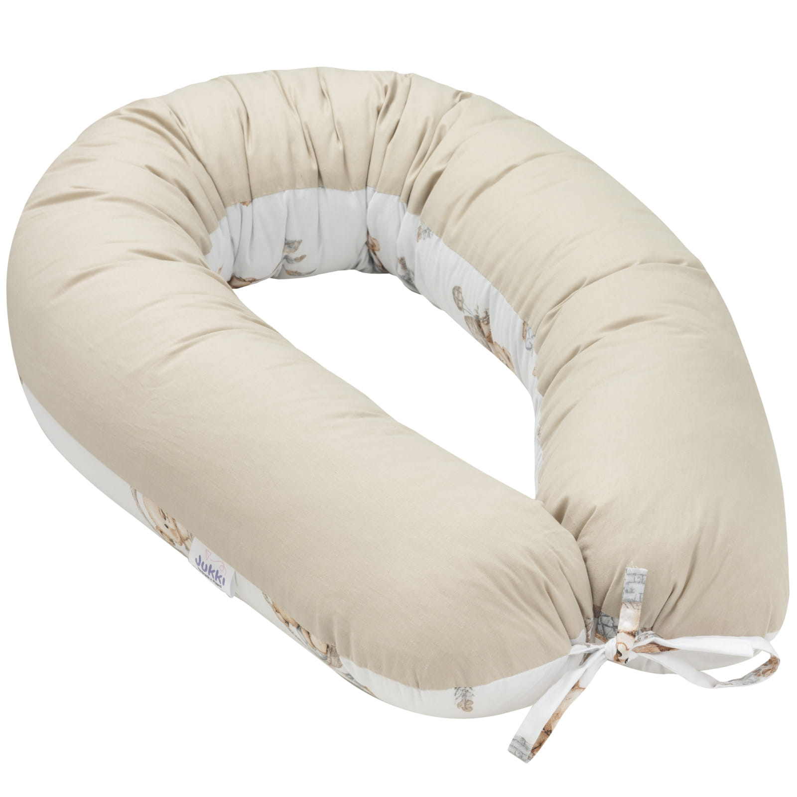 Poduszka ciążowa Jukki to również nieoceniona pomoc przy karmieniu niemowląt piersią oraz butelką. Poduszka umożliwia swobodne karmienie, dzięki czemu znacznie odciąża okolice rąk, ramion, szyi i pleców. Specjalne wypełnienie pozwala utrzymać stabilną i wygodną pozycję matki i dziecka podczas karmienia, bez względu na to, czy dziecko jest karmione w pozycji siedzącej czy leżącej. Można ją podłożyć pod plecy i jako podparcie pod rękę zapewniając równocześnie wygodne ułożenie dziecka na kolanach mamy. Poduszkę można uformować jak gniazdko i ułożyć w nim dziecko, troczki trzymają brzegi i stabilizują poduszkę. Później, gdy dziecko próbuje samodzielnie siadać, zapewnia asekurację Maluszka.