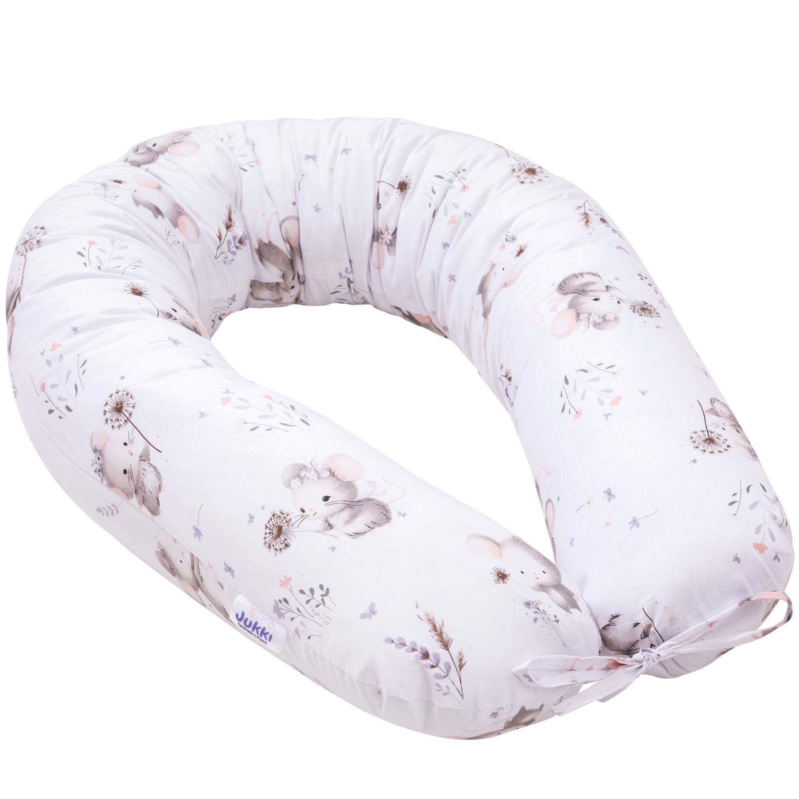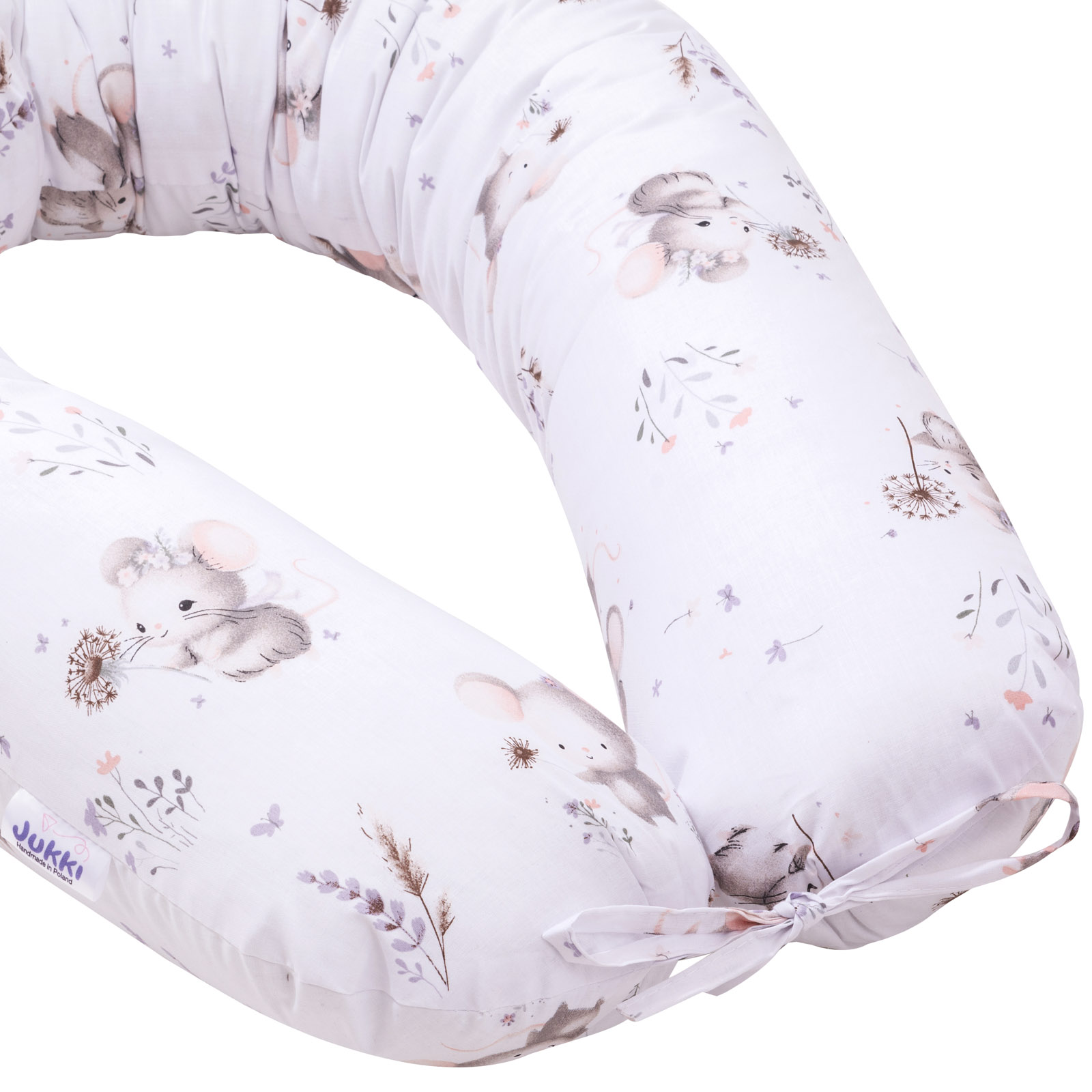 Poduszka ciążowa Jukki to również nieoceniona pomoc przy karmieniu niemowląt piersią oraz butelką. Poduszka umożliwia swobodne karmienie, dzięki czemu znacznie odciąża okolice rąk, ramion, szyi i pleców. Specjalne wypełnienie pozwala utrzymać stabilną i wygodną pozycję matki i dziecka podczas karmienia, bez względu na to, czy dziecko jest karmione w pozycji siedzącej czy leżącej. Można ją podłożyć pod plecy i jako podparcie pod rękę zapewniając równocześnie wygodne ułożenie dziecka na kolanach mamy. Poduszkę można uformować jak gniazdko i ułożyć w nim dziecko, troczki trzymają brzegi i stabilizują poduszkę. Później, gdy dziecko próbuje samodzielnie siadać, zapewnia asekurację Maluszka.