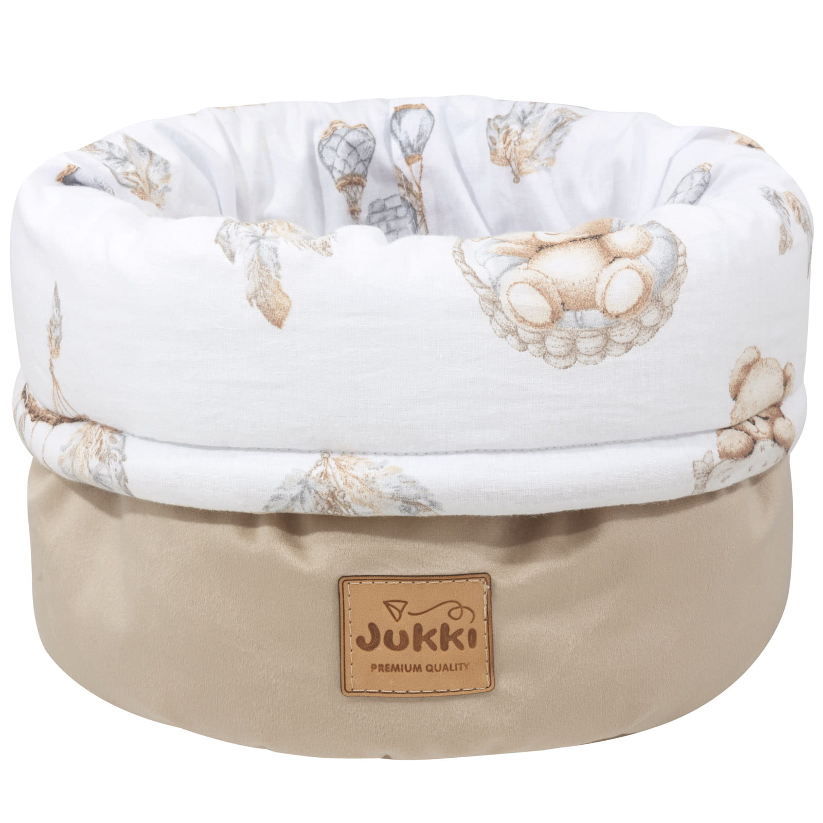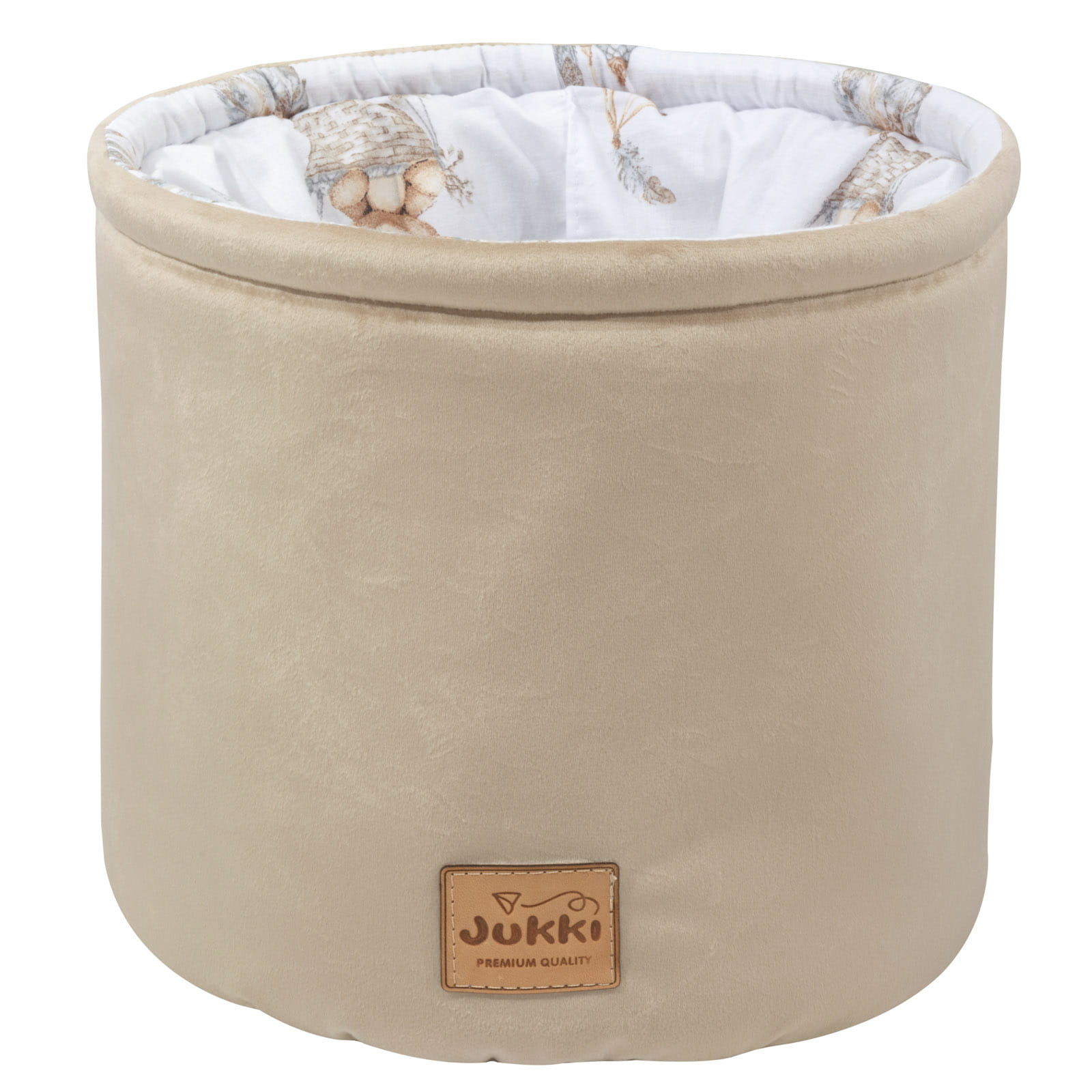 Koszyk Jukki jest uszyty ręcznie z naturalnej, 100% tkaniny bawełnianej z dodatkiem tkaniny Velvet. Wypełnienie organizera to antyalergiczna włóknina silikonowa o gramaturze 300g/m2.