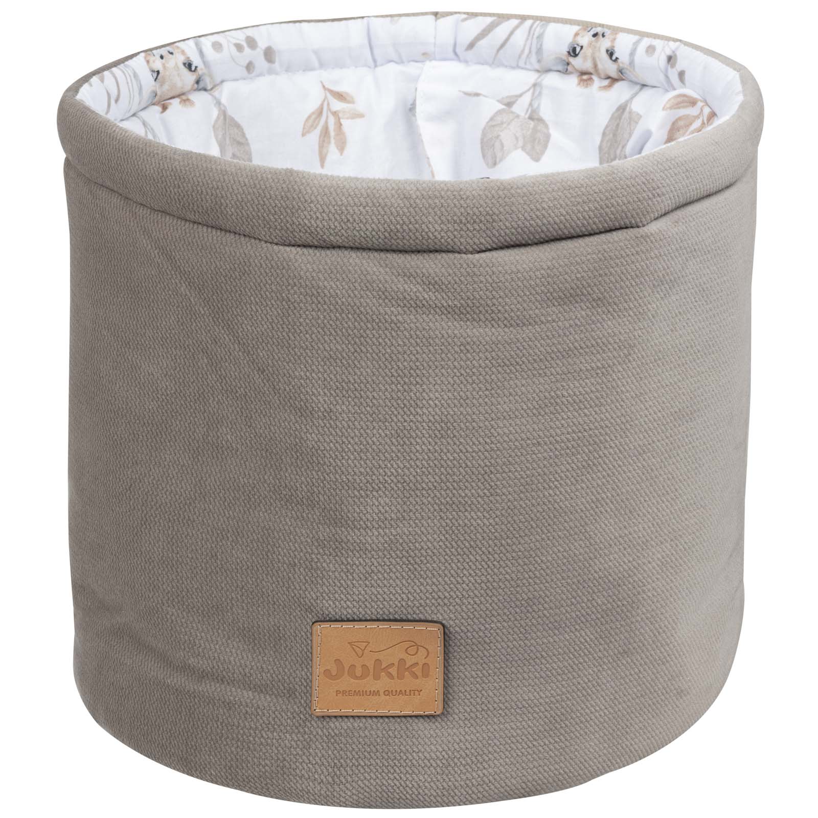 Koszyk Jukki jest uszyty ręcznie z naturalnej, 100% tkaniny bawełnianej z dodatkiem tkaniny Velvet. Wypełnienie organizera to antyalergiczna włóknina silikonowa o gramaturze 300g/m2.