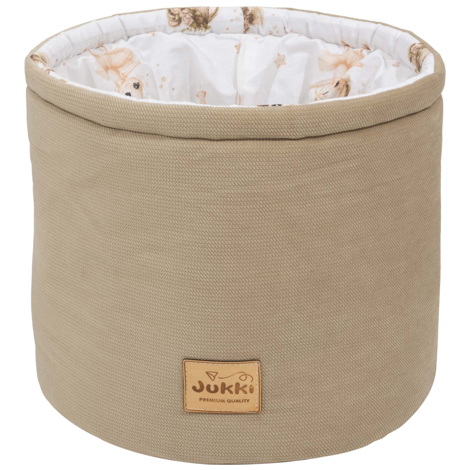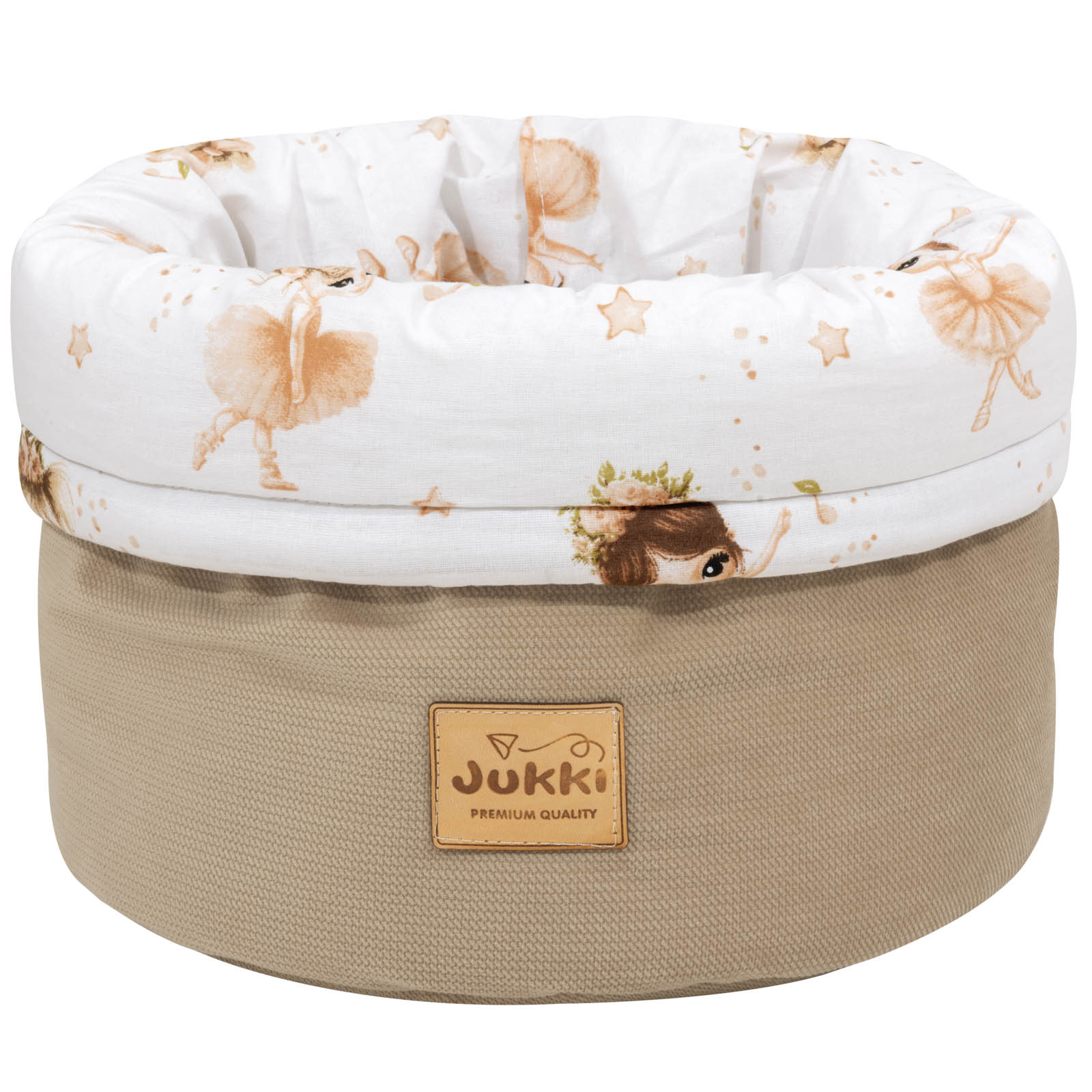 Koszyk Jukki jest uszyty ręcznie z naturalnej, 100% tkaniny bawełnianej z dodatkiem tkaniny Velvet. Wypełnienie organizera to antyalergiczna włóknina silikonowa o gramaturze 300g/m2.