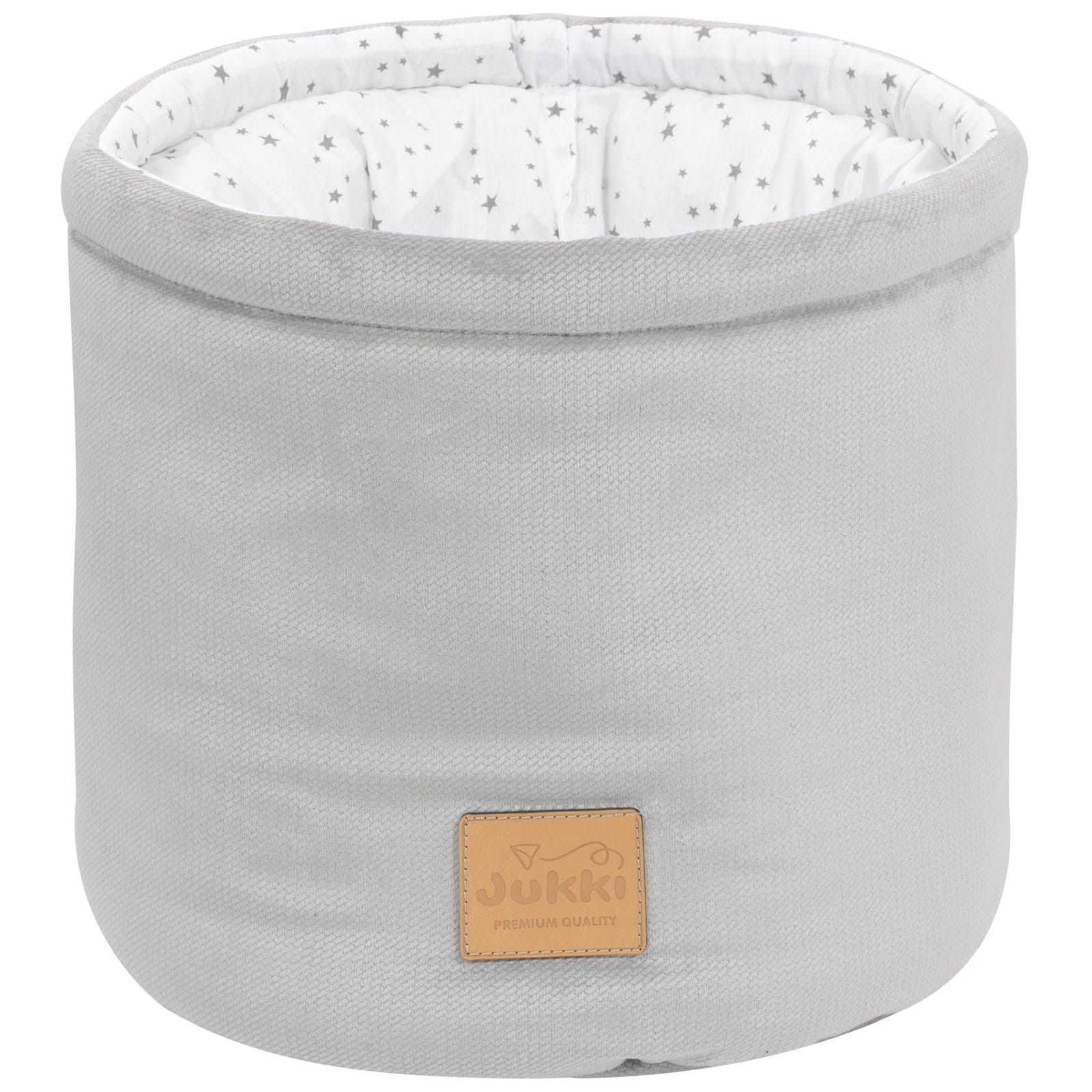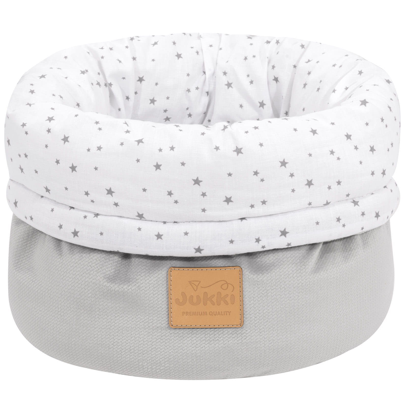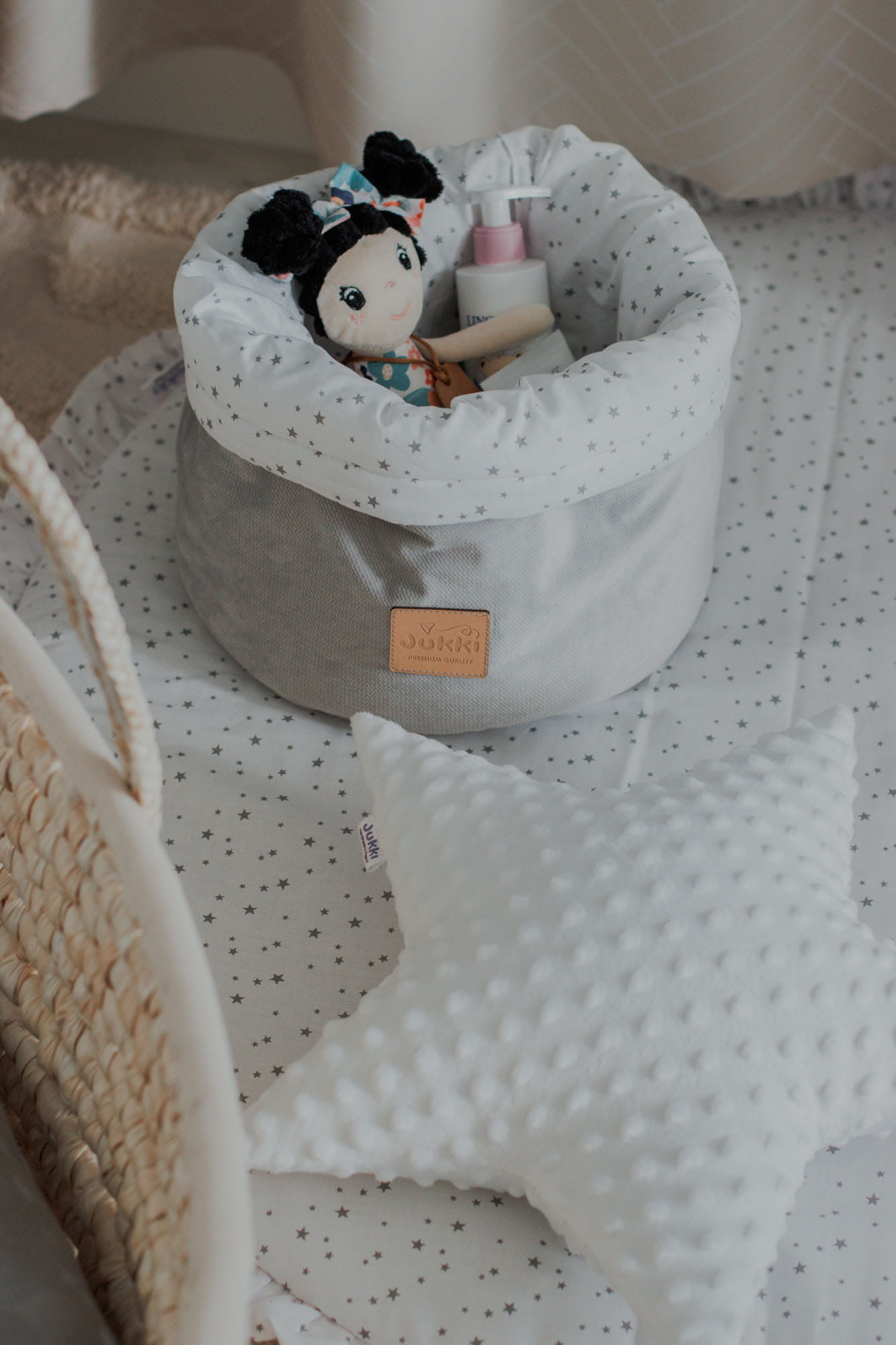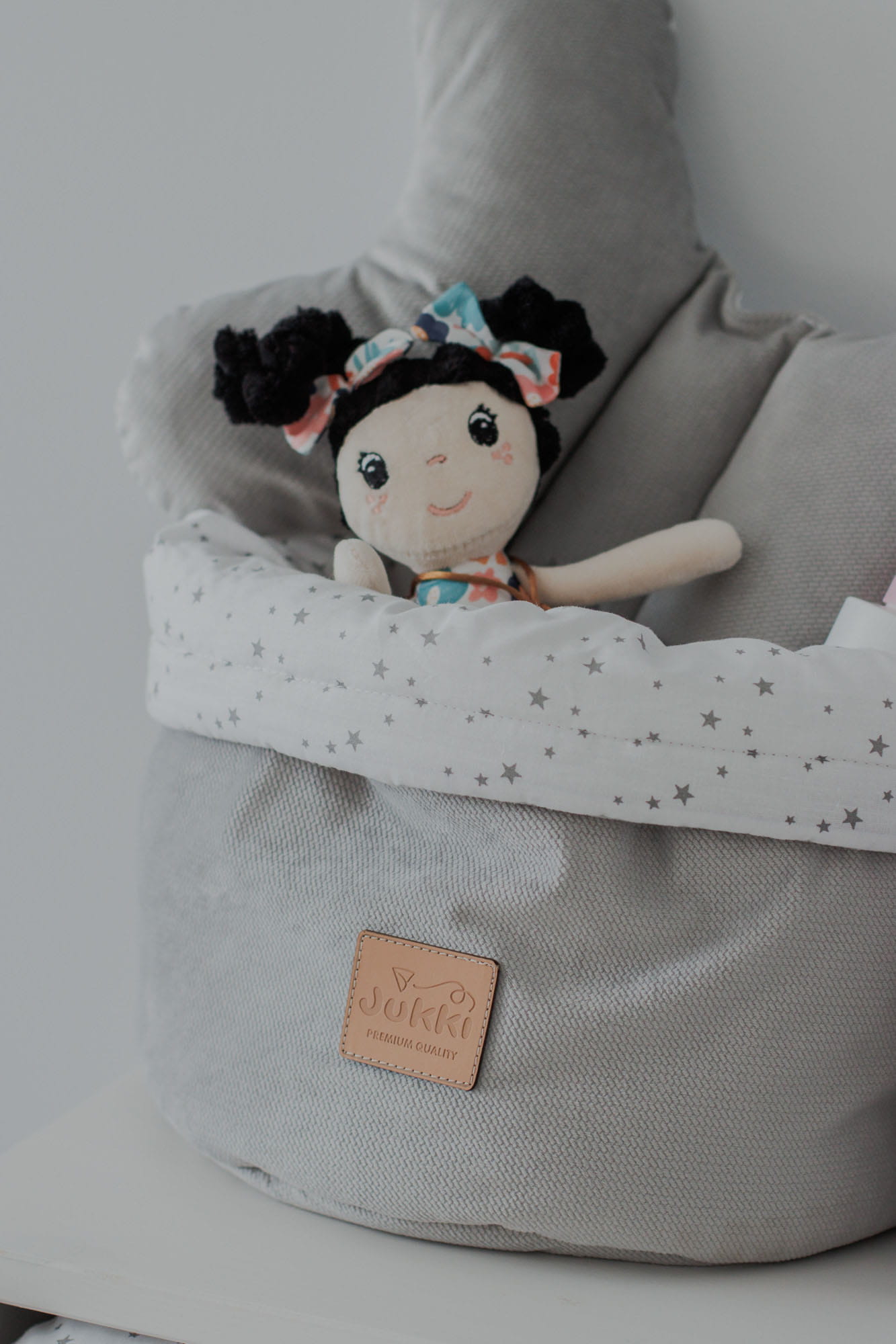 Koszyk Jukki jest uszyty ręcznie z naturalnej, 100% tkaniny bawełnianej z dodatkiem tkaniny Velvet. Wypełnienie organizera to antyalergiczna włóknina silikonowa o gramaturze 300g/m2.