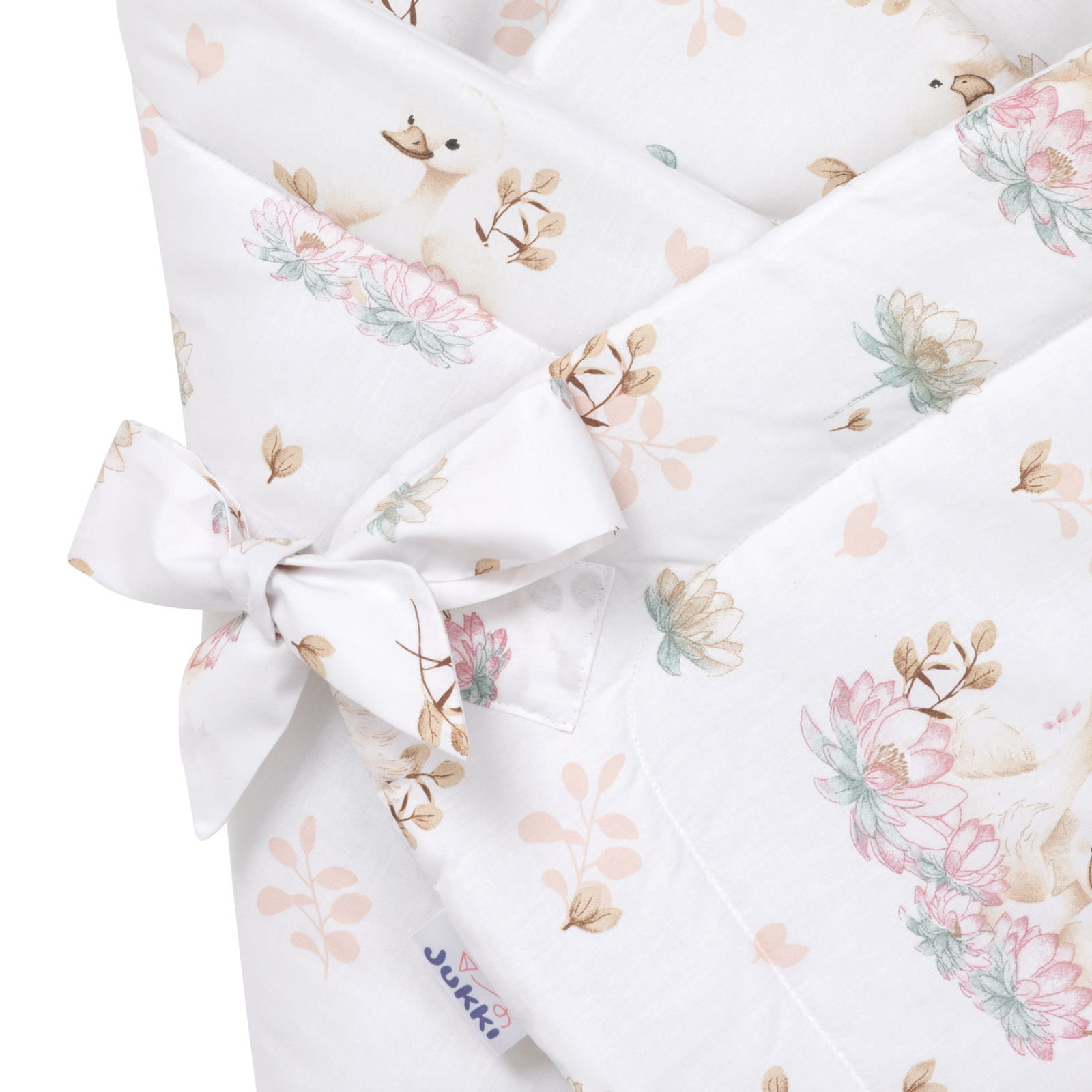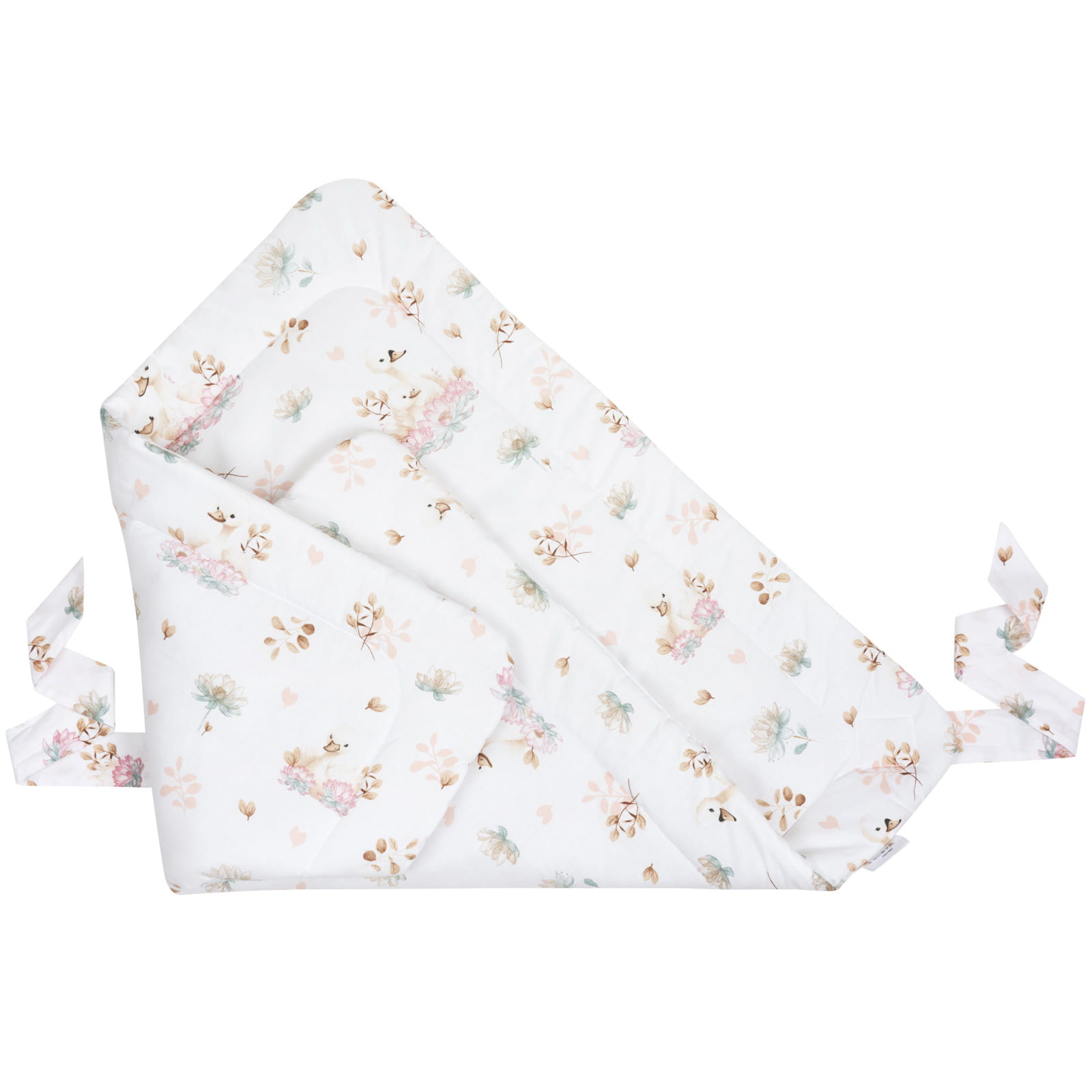 Rożek z dwóch stron wykonany jest z bawełny. Posiada piękną kokardę, dzięki której możemy regulować sposób jego wiązania. Wnętrze rożka składa się z warstwy antyalergicznej włókniny silikonowej, która stanowi idealne wypełnienie nadające rożkowi odpowiednią sztywność jednocześnie dając poczucie miękkości i komfortu dla Maluszka.