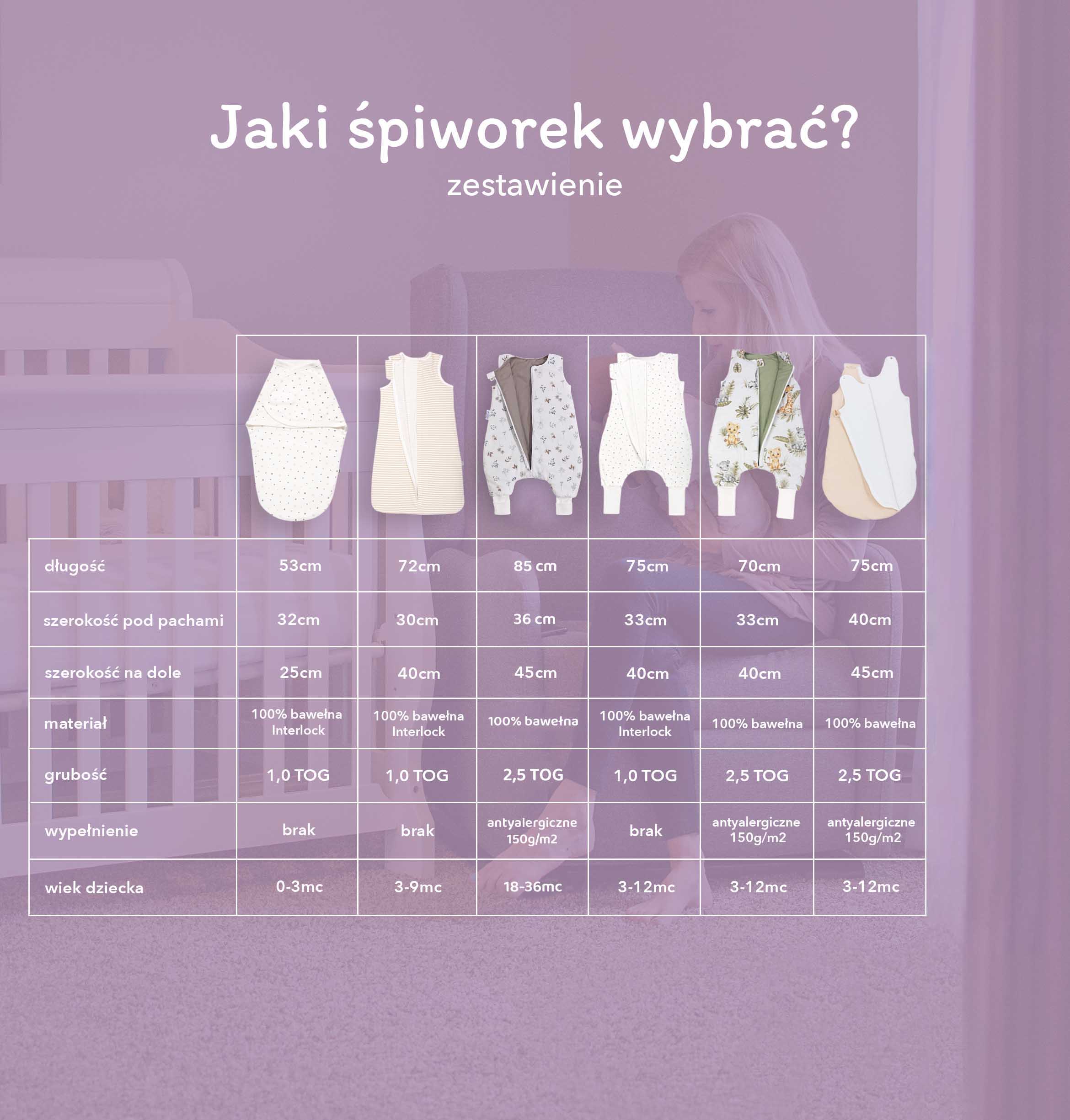 - Grubość to 2.5 TOG – śpiworek jest całoroczny i zapewnia komfort termiczny podczas snu w temperaturze pokojowej (18-21ºC).
