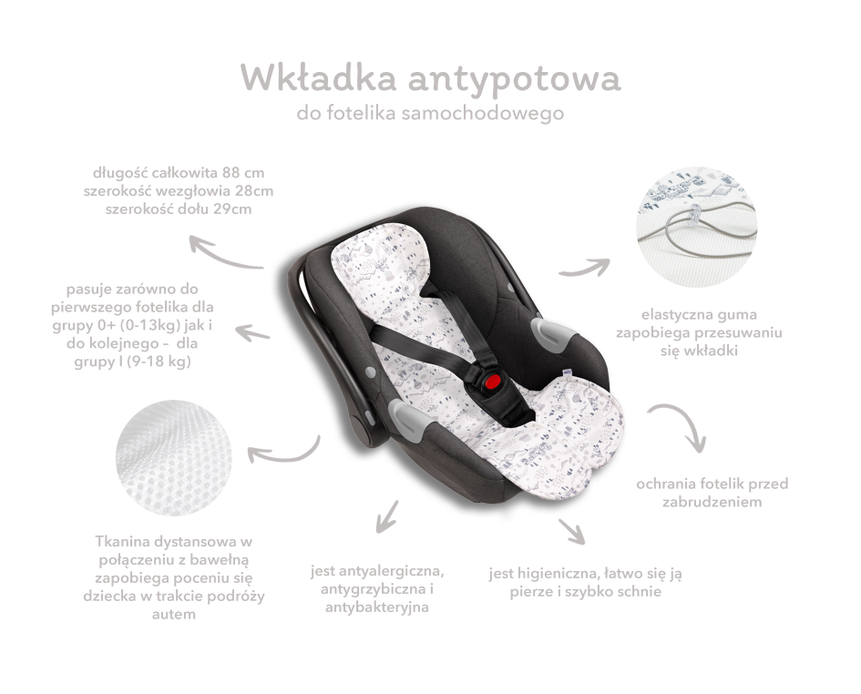 - zapewnia optymalny przepływ powietrza i zmniejsza pocenie się dziecka w trakcie podróży autem - absolutny must have w okresie letnim!