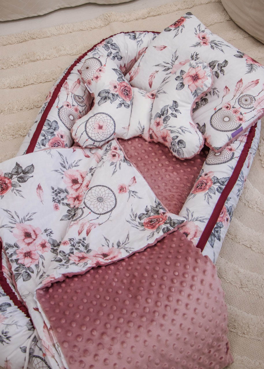 Gniazdko doskonale służy także starszym maluszkom stając się idealną przestrzenią do zabawy, leżenia na brzuszku i pierwszych ćwiczeń – podnoszenia główki czy leżących w jego zasięgu grzechotek. Rozwiązanie sznurków pozwala na używanie kokonu jako przewijaka.