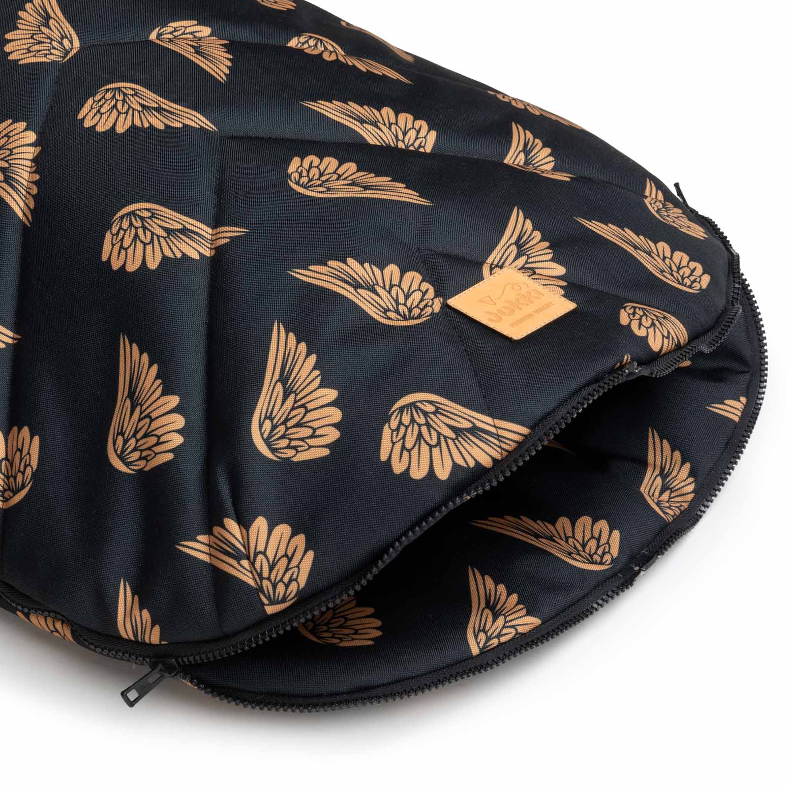 - Sprytnie zaprojektowany kaptur, zapinany na napy pozwala na modyfikację śpiworka i rozłożenie go całkiem na płasko, np. w sankach.